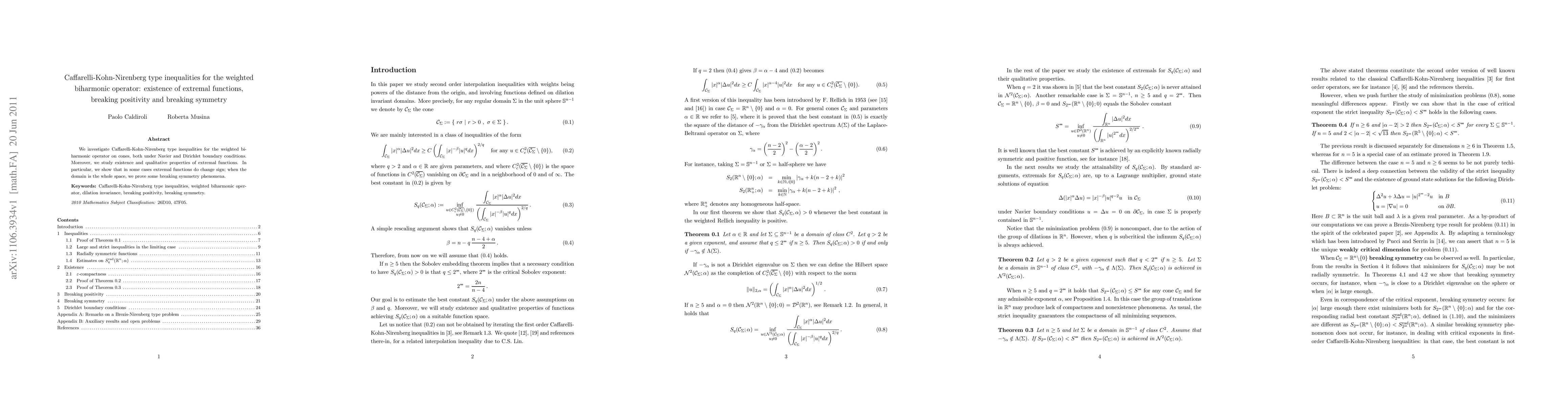 Summary: This paper explores Caffarelli-Kohn-Nirenberg inequalities for the weighted biharmonic operator on cones, examines extremal functions, and reveals instances where these functions can change sign or exhibit breaking symmetry in specific domains.