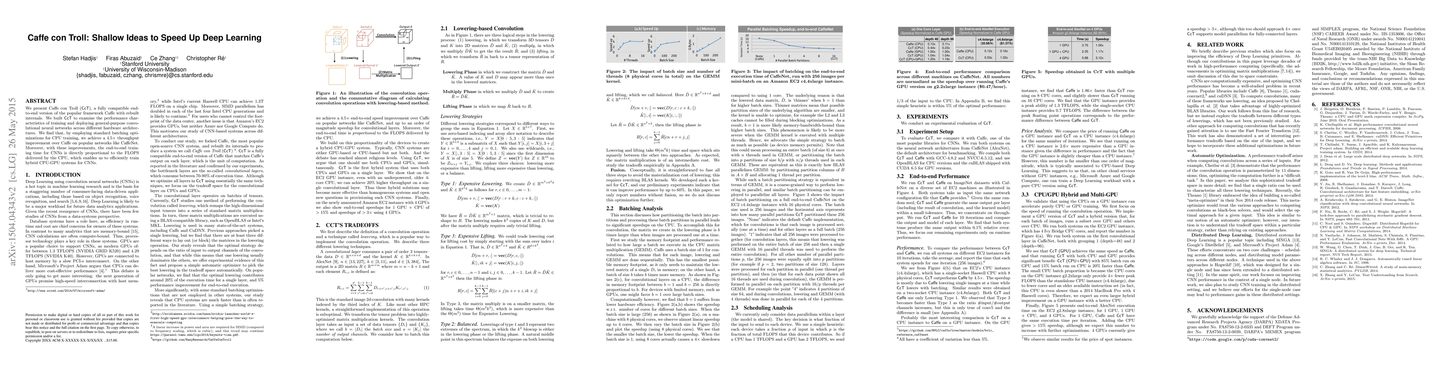 We present Caffe con Troll (CcT), a fully compatible end-to-end version of the popular framework Caffe with rebuilt internals. We built CcT to examine the performance characteristics of training and deploying general-purpose convolutional neural networks across different hardware architectures. We find that, by employing standard batching optimizations for CPU training, we achieve a 4.5x throughput improvement over Caffe on popular networks like CaffeNet. Moreover, with these improvements, the end-to-end training time for CNNs is directly proportional to the FLOPS delivered by the CPU, which enables us to efficiently train hybrid CPU-GPU systems for CNNs.