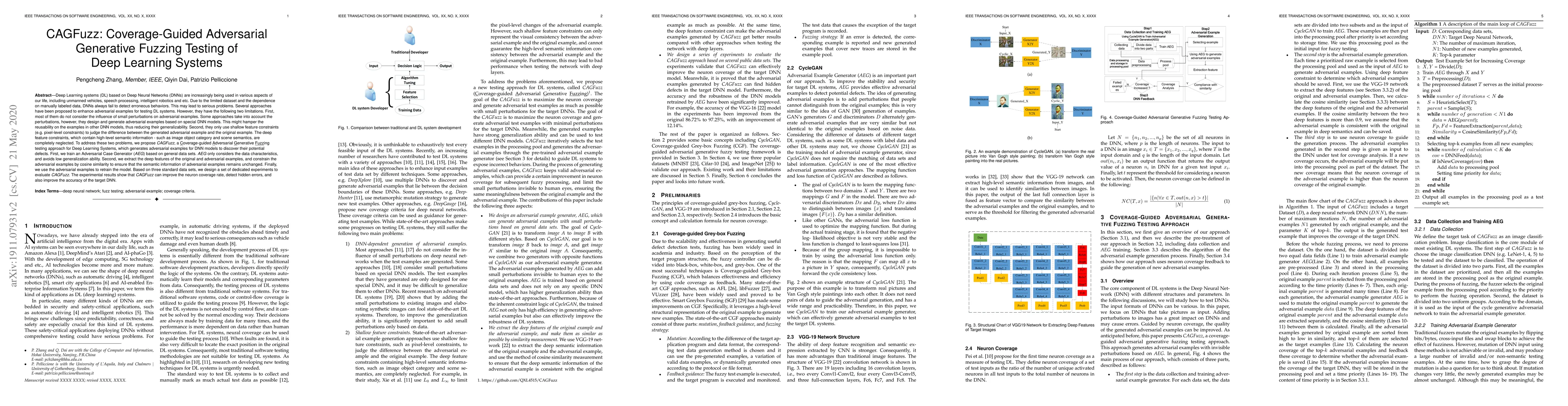 CAGFuzz proposes a novel adversarial generative fuzzing approach to enhance testing of Deep Neural Networks (DNNs) by generating adversarial examples that maintain high-level semantic information, improving neuron coverage, and detecting hidden errors in DNNs. This method addresses limitations of existing approaches by leveraging deep feature constraints and coverage-guided retraining.