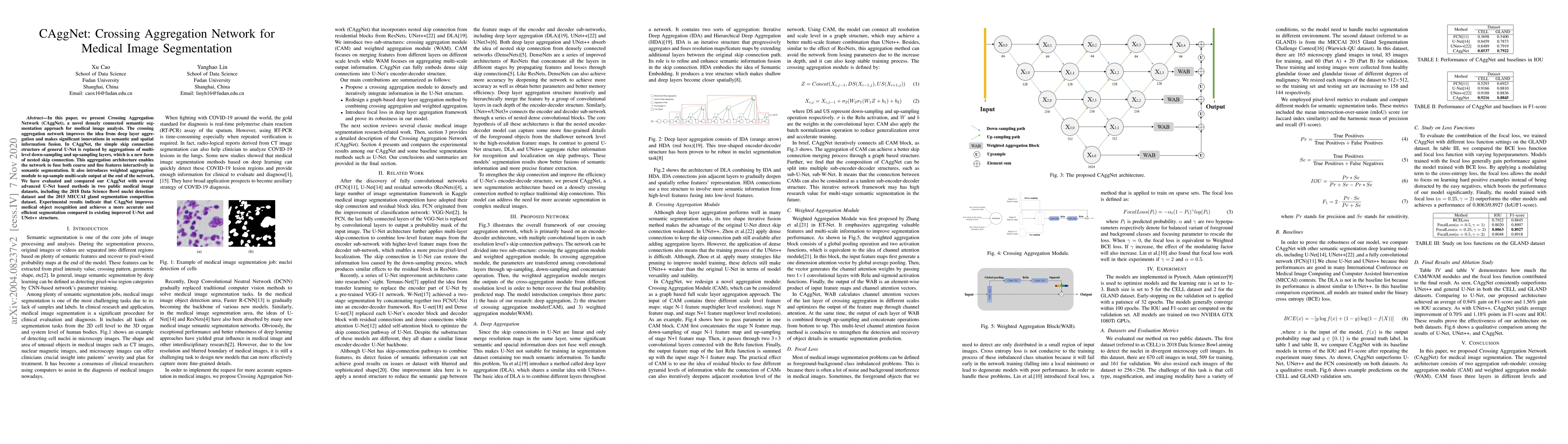 In this paper, we present Crossing Aggregation Network (CAggNet), a novel densely connected semantic segmentation approach for medical image analysis. The crossing aggregation network improves the idea from deep layer aggregation and makes significant innovations in semantic and spatial information fusion. In CAggNet, the simple skip connection structure of general U-Net is replaced by aggregations of multi-level down-sampling and up-sampling layers, which is a new form of nested skip connection. This aggregation architecture enables the network to fuse both coarse and fine features interactively in semantic segmentation. It also introduces weighted aggregation module to up-sample multi-scale output at the end of the network. We have evaluated and compared our CAggNet with several advanced U-Net based methods in two public medical image datasets, including the 2018 Data Science Bowl nuclei detection dataset and the 2015 MICCAI gland segmentation competition dataset. Experimental results indicate that CAggNet improves medical object recognition and achieves a more accurate and efficient segmentation compared to existing improved U-Net and UNet++ structure.