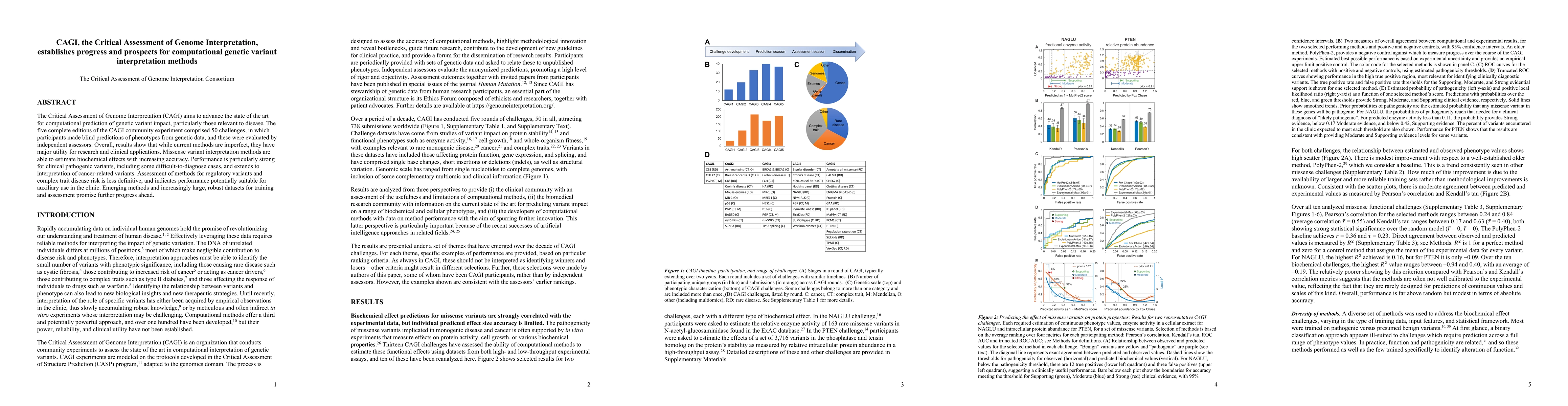 The CAGI initiative assesses the progress and outlook of computational methods for interpreting genetic variants, revealing significant utility for research and clinical applications, especially in diagnosing pathogenic variants. While methods for regulatory variants and complex diseases show potential, ongoing improvements and larger datasets promise future advancements.