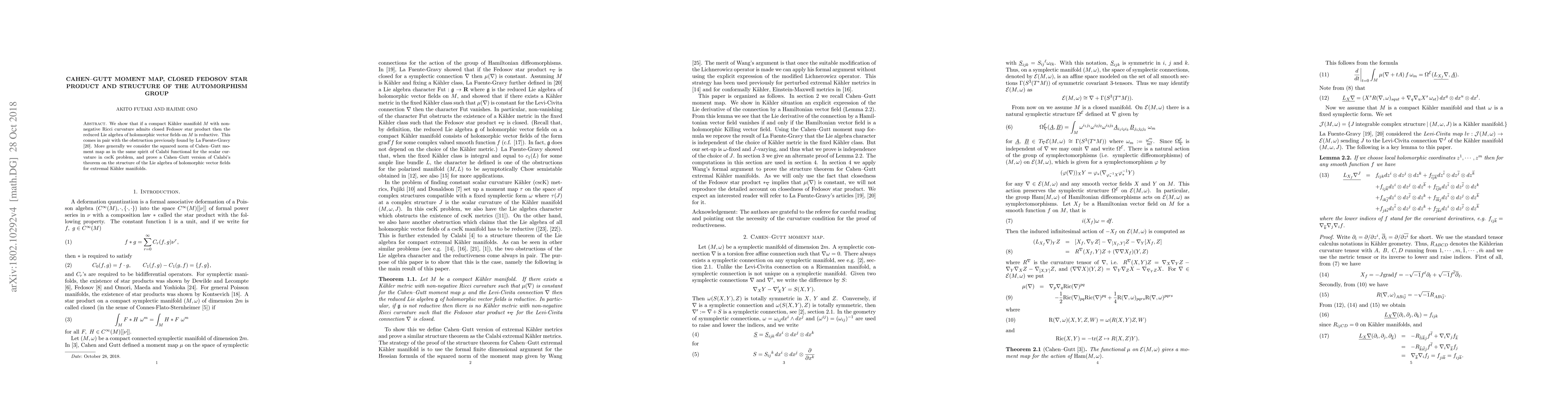 This paper demonstrates that for compact Kähler manifolds with non-negative Ricci curvature and closed Fedosov star product, the reduced Lie algebra of holomorphic vector fields is reductive. It also proves a Cahen-Gutt version of Calabi's theorem, linking the squared norm of the Cahen-Gutt moment map to the structure of the Lie algebra of holomorphic vector fields in extremal Kähler manifolds.