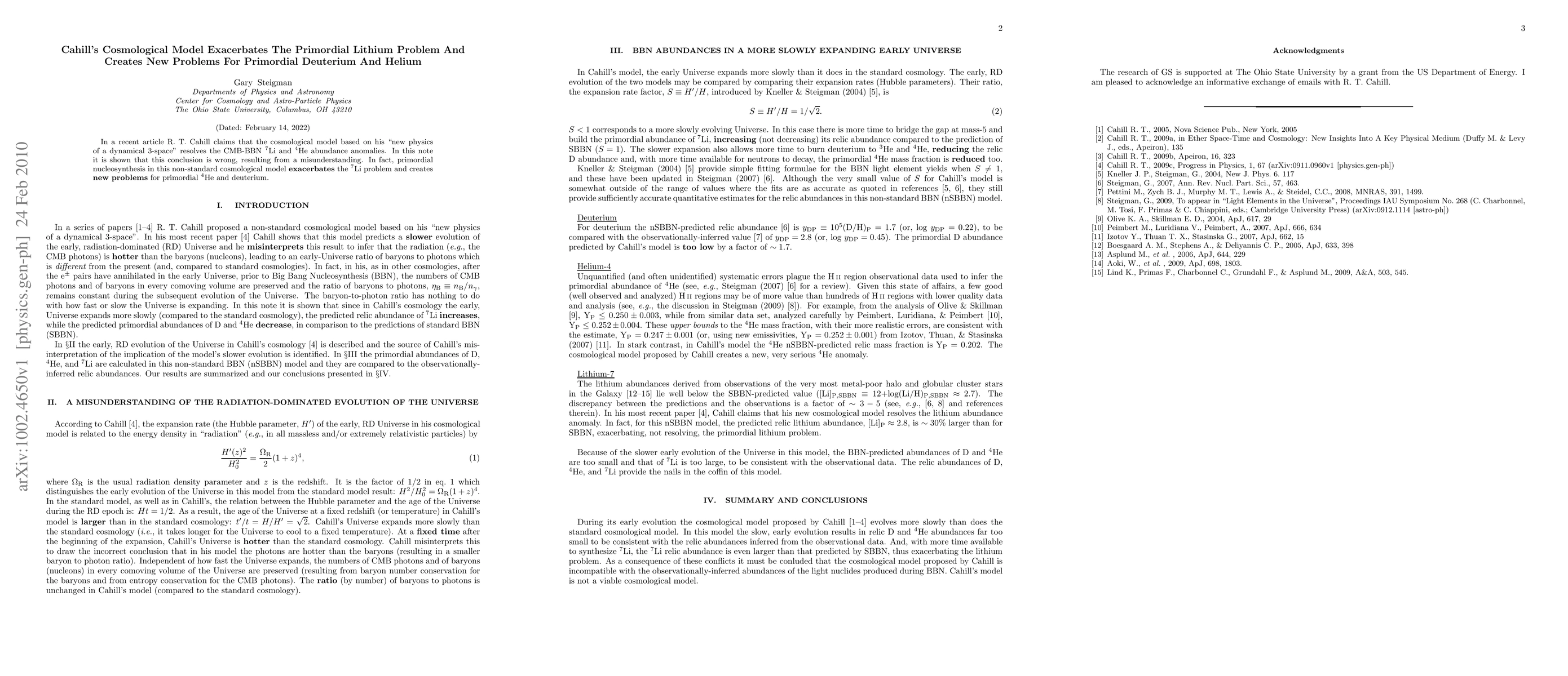 Title: Cahill's Cosmological Model Exacerbates The Primordial Lithium Problem And Creates New Problems For Primordial Deuterium And Helium Summary: This paper refutes Cahill's claim that his cosmological model resolves anomalies in the primordial abundances of Lithium-7, Helium-4, and Deuterium, showing instead that it worsens the Lithium-7 problem and introduces new issues for Helium-4 and Deuterium.