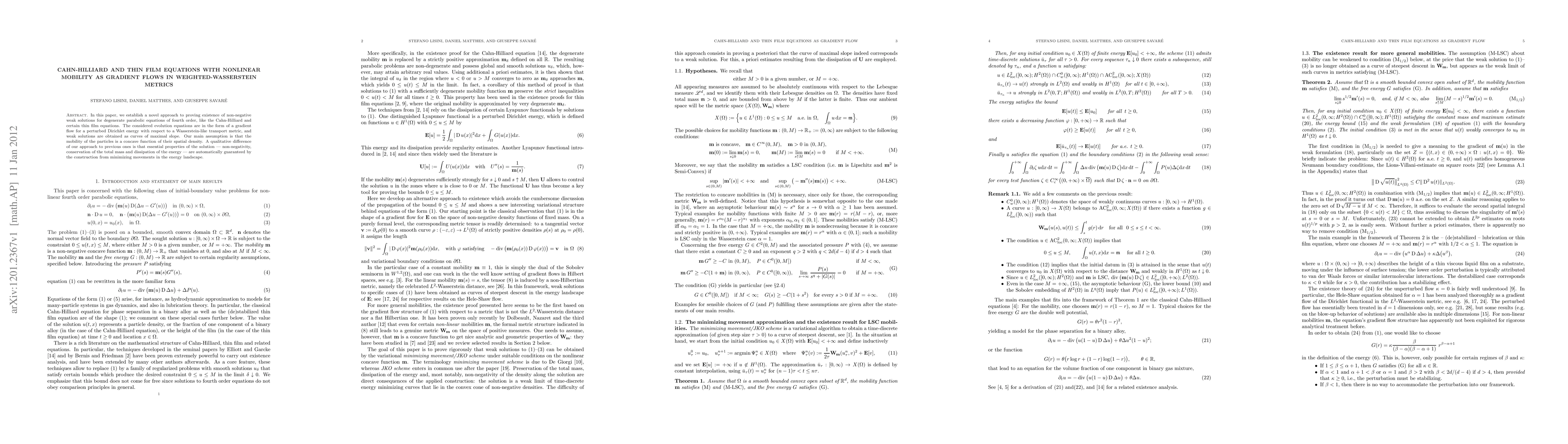 In this paper, we establish a novel approach to proving existence of non-negative weak solutions for degenerate parabolic equations of fourth order, like the Cahn-Hilliard and certain thin film equations. The considered evolution equations are in the form of a gradient flow for a perturbed Dirichlet energy with respect to a Wasserstein-like transport metric, and weak solutions are obtained as curves of maximal slope. Our main assumption is that the mobility of the particles is a concave function of their spatial density. A qualitative difference of our approach to previous ones is that essential properties of the solution - non-negativity, conservation of the total mass and dissipation of the energy - are automatically guaranteed by the construction from minimizing movements in the energy landscape.