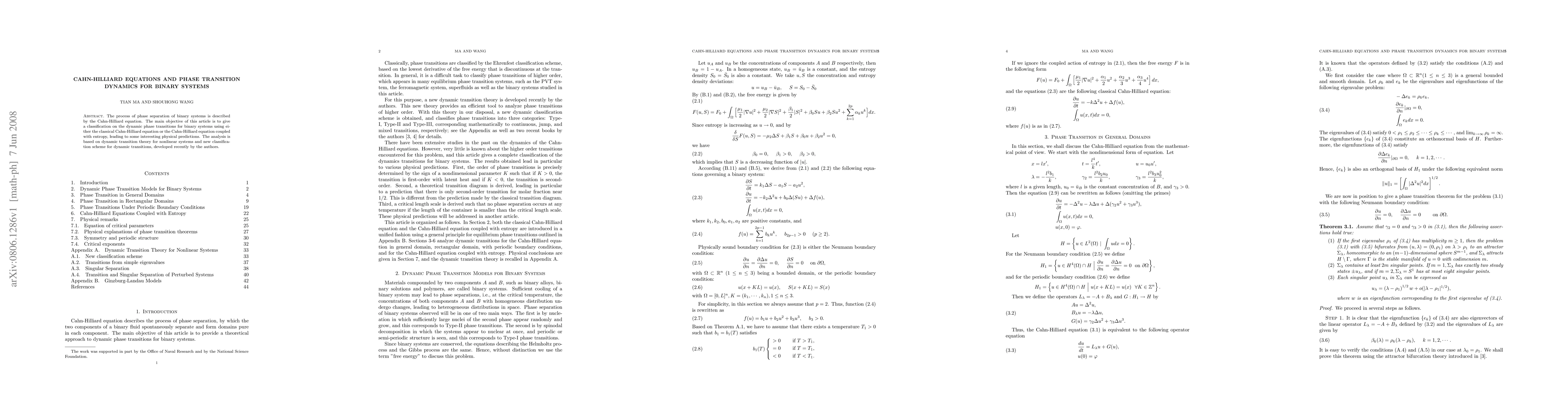 This paper classifies dynamic phase transitions in binary systems using the Cahn-Hilliard equation and its entropy-coupled variant, employing dynamic transition theory and a new classification scheme developed by the authors to derive significant physical predictions.