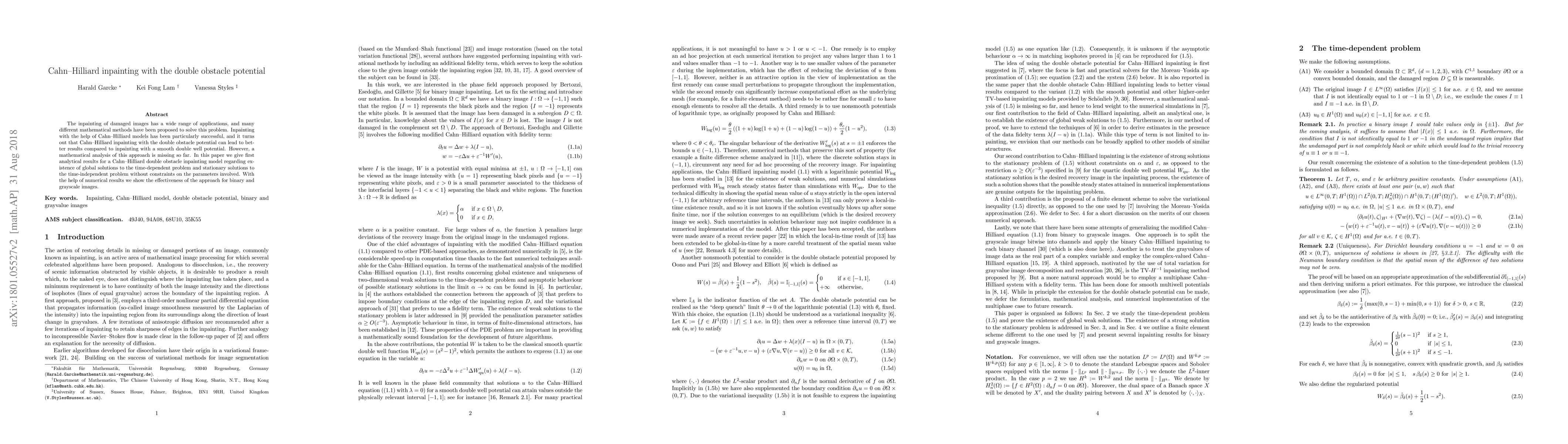 This paper presents the first mathematical analysis of Cahn--Hilliard inpainting with the double obstacle potential, proving existence of global solutions for both time-dependent and time-independent problems without parameter constraints. Numerical results demonstrate the approach's effectiveness for binary and grayscale image restoration.