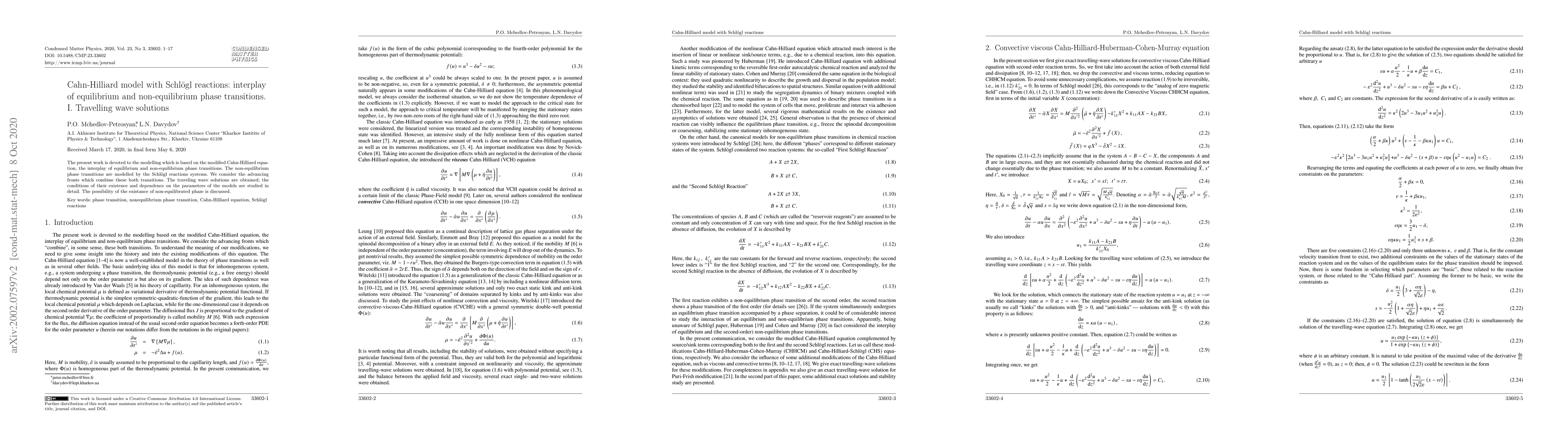 The present work is devoted to the modelling which is based on the modified Cahn-Hilliard equation, the interplay of equilibrium and non-equilibrium phase transitions. The non-equilibrium phase transitions are modelled by the Schl\"ogl reactions systems. We consider the advancing fronts which combine these both transitions. The traveling wave solutions are obtained; the conditions of their existence and dependence on the parameters of the models are studied in detail. The possibility of the existance of non-equilibrated phase is discussed.