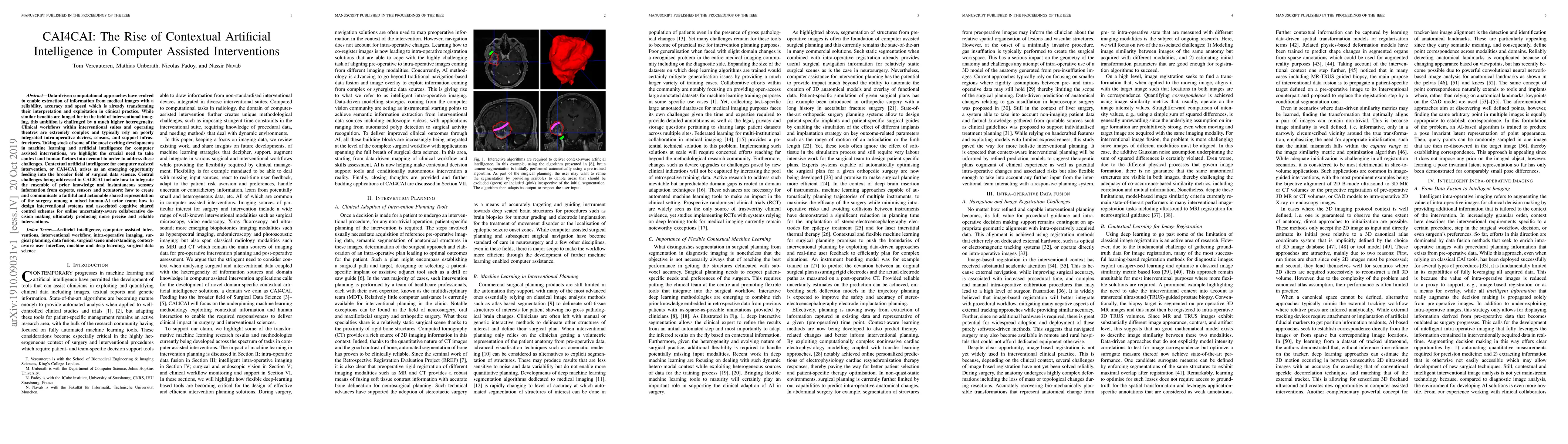 Data-driven computational approaches have evolved to enable extraction of information from medical images with a reliability, accuracy and speed which is already transforming their interpretation and exploitation in clinical practice. While similar benefits are longed for in the field of interventional imaging, this ambition is challenged by a much higher heterogeneity. Clinical workflows within interventional suites and operating theatres are extremely complex and typically rely on poorly integrated intra-operative devices, sensors, and support infrastructures. Taking stock of some of the most exciting developments in machine learning and artificial intelligence for computer assisted interventions, we highlight the crucial need to take context and human factors into account in order to address these challenges. Contextual artificial intelligence for computer assisted intervention, or CAI4CAI, arises as an emerging opportunity feeding into the broader field of surgical data science. Central challenges being addressed in CAI4CAI include how to integrate the ensemble of prior knowledge and instantaneous sensory information from experts, sensors and actuators; how to create and communicate a faithful and actionable shared representation of the surgery among a mixed human-AI actor team; how to design interventional systems and associated cognitive shared control schemes for online uncertainty-aware collaborative decision making ultimately producing more precise and reliable interventions.
