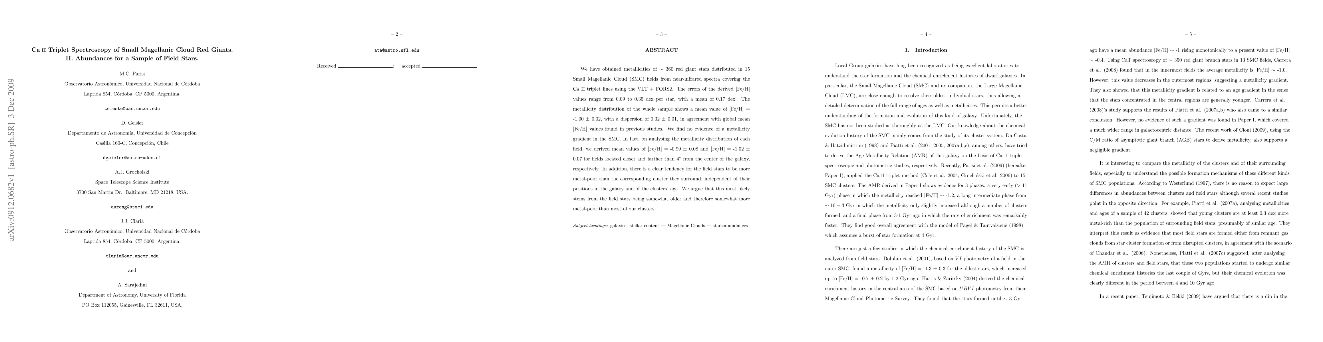 We have obtained metallicities of ~ 360 red giant stars distributed in 15 Small Magellanic Cloud (SMC) fields from near-infrared spectra covering the CaII triplet lines using the VLT + FORS2. The errors of the derived [Fe/H] values range from 0.09 to 0.35 dex per star, with a mean of 0.17 dex. The metallicity distribution of the whole sample shows a mean value of [Fe/H] = -1.00 +- 0.02, with a dispersion of 0.32 +- 0.01, in agreement with global mean [Fe/H] values found in previous studies. We find no evidence of a metallicity gradient in the SMC. In fact, on analysing the metallicity distribution of each field, we derived mean values of [Fe/H] = -0.99 +- 0.08 and [Fe/H] = -1.02 +- 0.07 for fields located closer and farther than 4 deg. from the center of the galaxy, respectively. In addition, there is a clear tendency for the field stars to be more metal-poor than the corresponding cluster they surround, independent of their positions in the galaxy and of the clusters' age. We argue that this most likely stems from the field stars being somewhat older and therefore somewhat more metal-poor than most of our clusters.