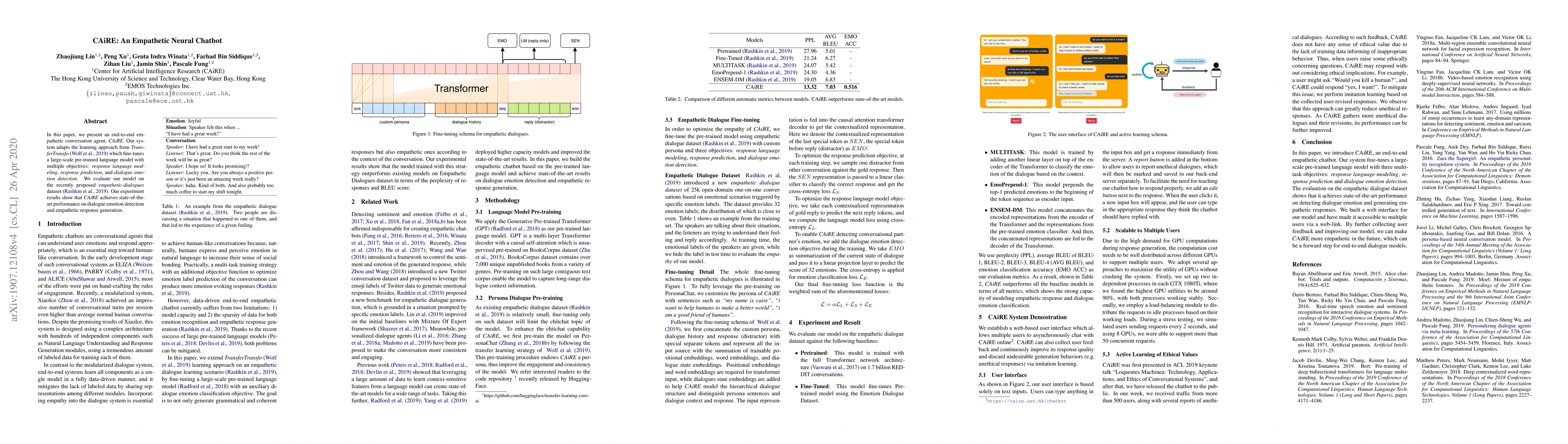 CAiRE is an empathetic neural chatbot that fine-tunes a large-scale pre-trained language model using a multi-task learning approach. It achieves state-of-the-art performance in dialogue emotion detection and empathetic response generation on the empathetic-dialogues dataset.