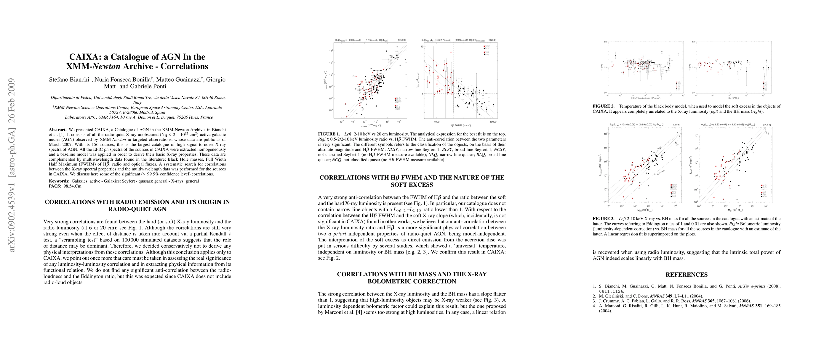 We presented CAIXA, a Catalogue of AGN in the XMM-Newton Archive, in Bianchi et al. (2009). It consists of all the radio-quiet X-ray unobscured (N$_\mathrm{H}<2\times10^{22}$ cm$^{-2}$) active galactic nuclei (AGN) observed by XMM-Newton in targeted observations, whose data are public as of March 2007. With its 156 sources, this is the largest catalogue of high signal-to-noise X-ray spectra of AGN. All the EPIC pn spectra of the sources in CAIXA were extracted homogeneously and a baseline model was applied in order to derive their basic X-ray properties. These data are complemented by multiwavelength data found in the literature: Black Hole masses, Full Width Half Maximum (FWHM) of Hbeta, radio and optical fluxes. A systematic search for correlations between the X-ray spectral properties and the multiwavelength data was performed for the sources in CAIXA. We discuss here some of the significant (>99.9 % confidence level) correlations.