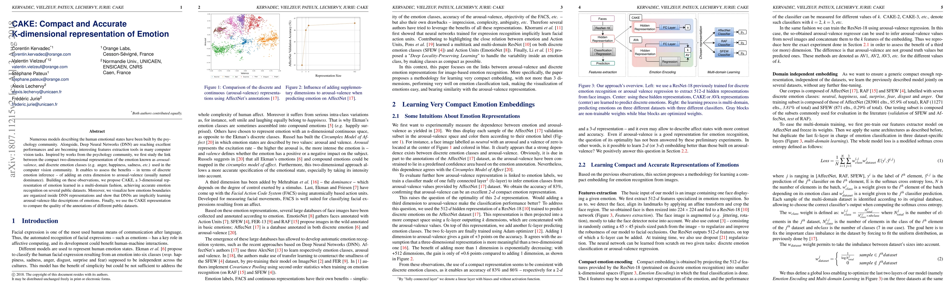 Numerous models describing the human emotional states have been built by the psychology community. Alongside, Deep Neural Networks (DNN) are reaching excellent performances and are becoming interesting features extraction tools in many computer vision tasks.Inspired by works from the psychology community, we first study the link between the compact two-dimensional representation of the emotion known as arousal-valence, and discrete emotion classes (e.g. anger, happiness, sadness, etc.) used in the computer vision community. It enables to assess the benefits -- in terms of discrete emotion inference -- of adding an extra dimension to arousal-valence (usually named dominance). Building on these observations, we propose CAKE, a 3-dimensional representation of emotion learned in a multi-domain fashion, achieving accurate emotion recognition on several public datasets. Moreover, we visualize how emotions boundaries are organized inside DNN representations and show that DNNs are implicitly learning arousal-valence-like descriptions of emotions. Finally, we use the CAKE representation to compare the quality of the annotations of different public datasets.