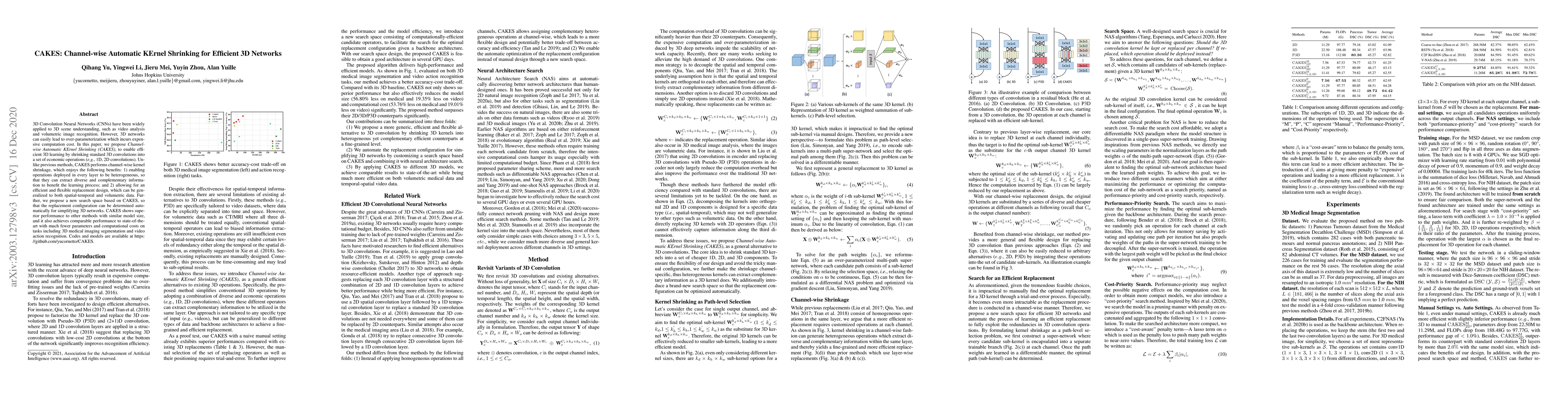 The paper introduces CAKES, a method for efficient 3D CNNs by shrinking 3D convolutions into cost-effective 1D and 2D convolutions through channel-wise kernel shrinkage, enabling heterogeneous operations across layers and automatic configuration search. CAKES achieves superior performance with fewer parameters and lower computational costs compared to other methods.