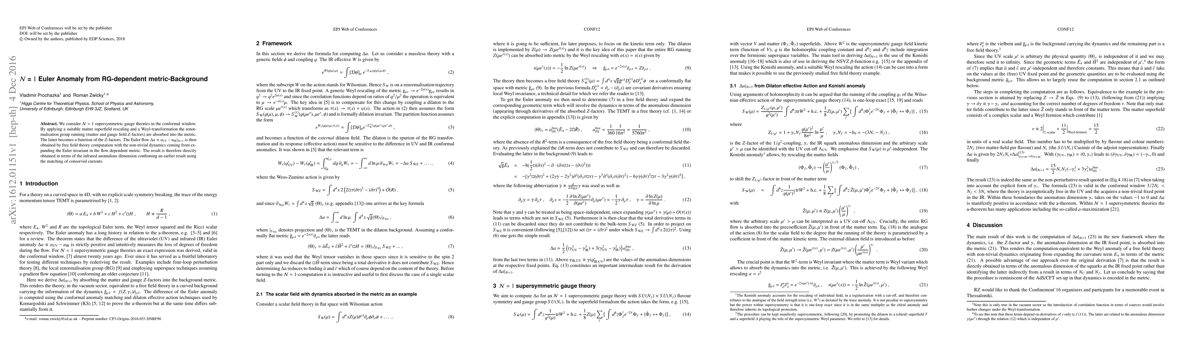 The paper introduces a novel method to compute the ${\cal N}=1$ supersymmetric gauge theory Euler anomaly by absorbing RG dynamics into a flow-dependent metric, simplifying the computation and connecting it to free field theory computations.