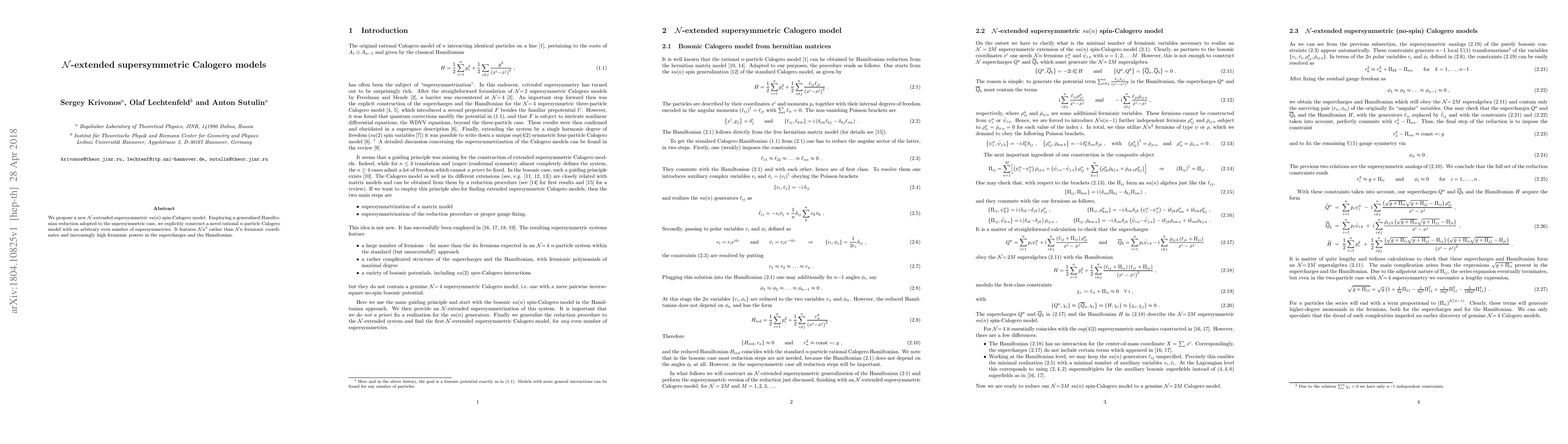 We propose a new ${\cal N}$-extended supersymmetric $su(n)$ spin-Calogero model. Employing a generalized Hamiltonian reduction adopted to the supersymmetric case, we explicitly construct a novel rational $n$-particle Calogero model with an arbitrary even number of supersymmetries. It features ${\cal N}n^2$ rather than ${\cal N}n$ fermionic coordinates and increasingly high fermionic powers in the supercharges and the Hamiltonian.