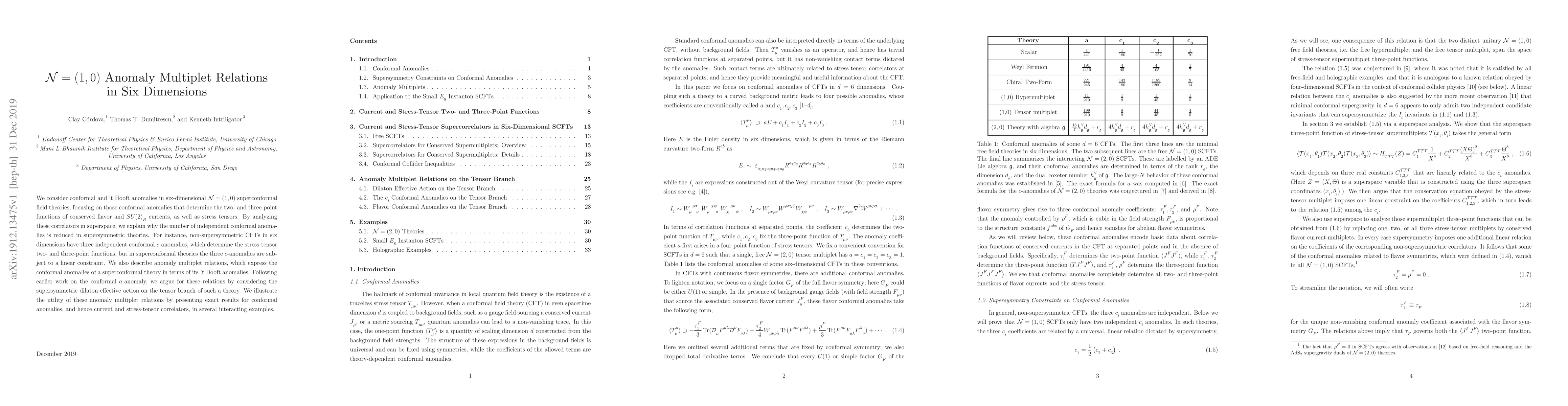 This paper studies conformal and 't Hooft anomalies in six-dimensional ${\cal N}=(1,0)$ superconformal field theories, demonstrating how supersymmetry reduces the number of independent conformal anomalies and presenting relations that express these anomalies in terms of 't Hooft anomalies.