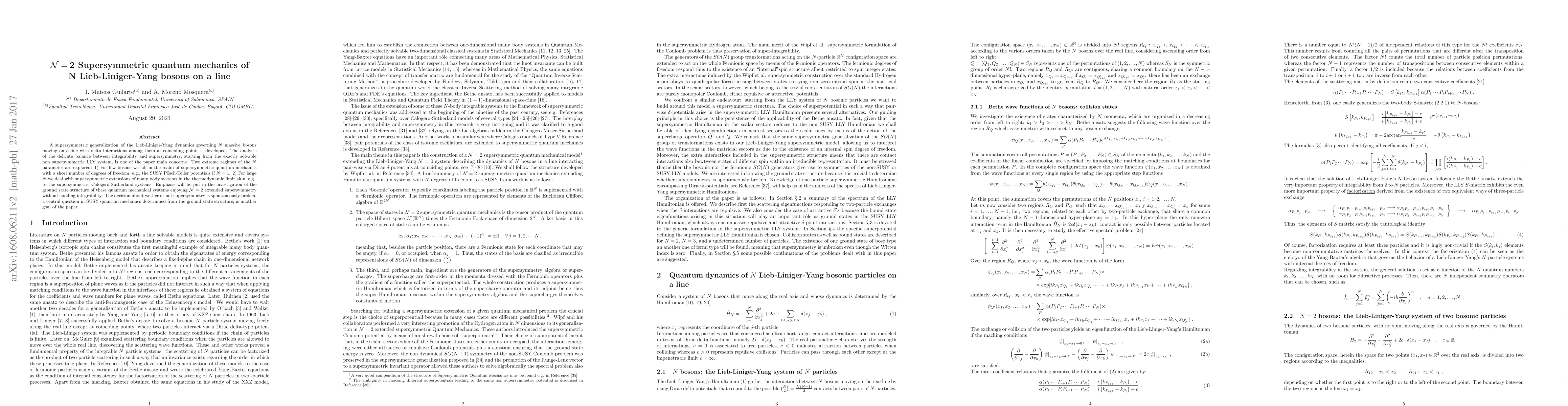 This paper develops a supersymmetric generalization of the Lieb-Liniger-Yang dynamics for $N$ bosons with delta interactions, exploring the balance between integrability and supersymmetry. It investigates the ground state structure of ${\cal N}=2$ supersymmetric quantum mechanics in both few-boson and large-$N$ regimes, aiming to determine whether supersymmetry is spontaneously broken.