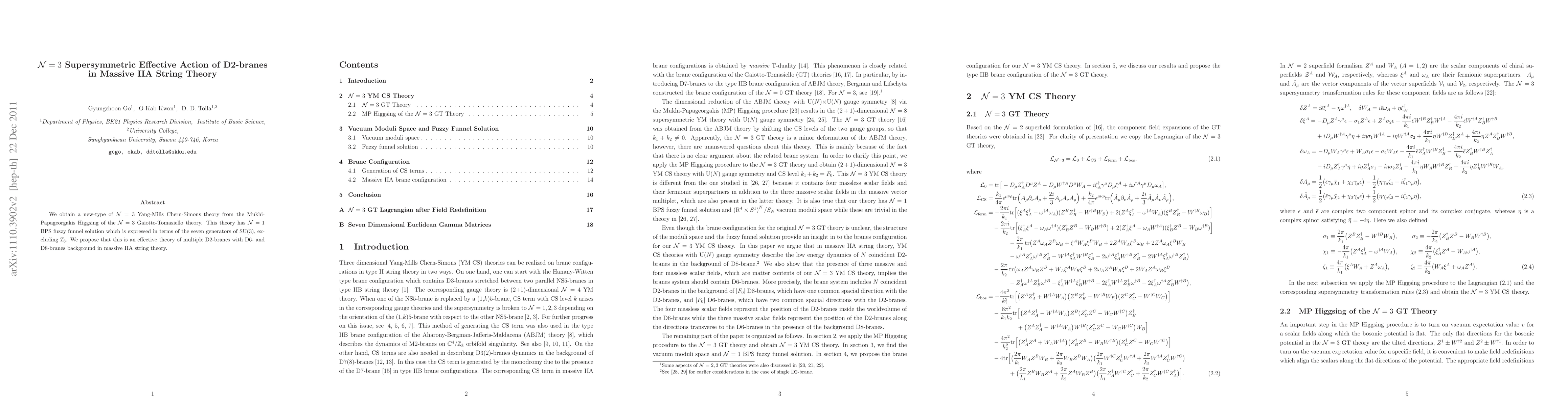 Summary: This paper develops a new ${\cal N}=3$ Yang-Mills Chern-Simons theory from the Mukhi-Papageorgakis Higgsing of the Gaiotto-Tomasiello theory, proposing it as an effective action for multiple D2-branes in a massive IIA string theory background with D6- and D8-branes. It features an ${\cal N}=1$ BPS fuzzy funnel solution expressed through SU(3) generators.