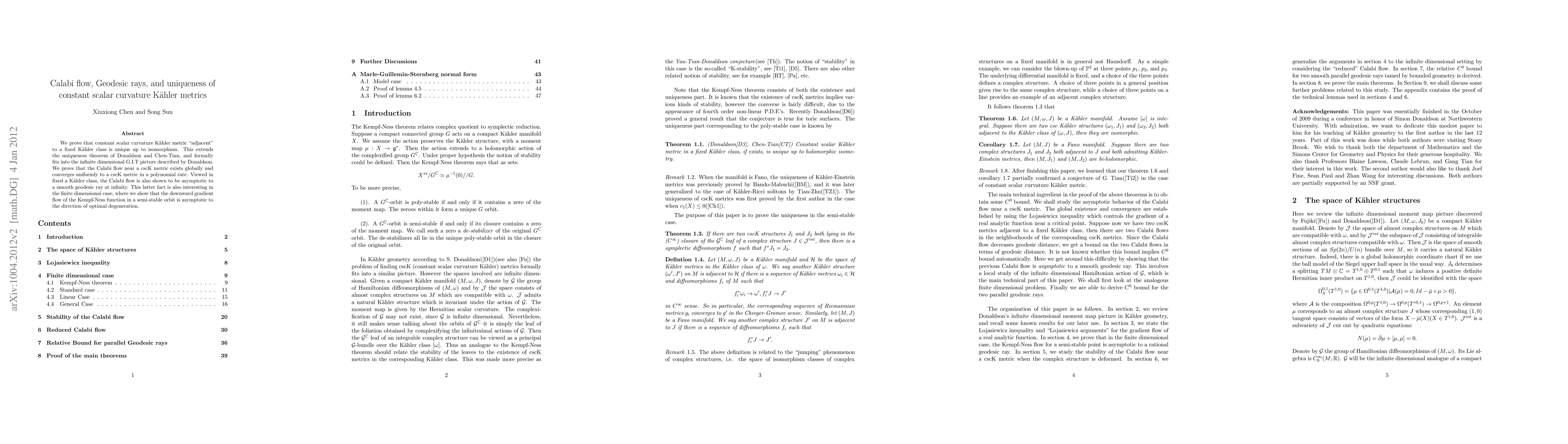 We prove that constant scalar curvature K\"ahler metric "adjacent" to a fixed K\"ahler class is unique up to isomorphism. This extends the uniqueness theorem of Donaldson and Chen-Tian, and formally fits into the infinite dimensional G.I.T picture described by Donaldson. We prove that the Calabi flow near a cscK metric exists globally and converges uniformly to a cscK metric in a polynomial rate. Viewed in a K\"ahler class, the Calabi flow is also shown to be asymptotic to a smooth geodesic ray at infinity. This latter fact is also interesting in the finite dimensional analogue, where we show that the downward gradient flow of the Kempf-Ness function in a semi-stable orbit is asymptotic to the direction of optimal degeneration.