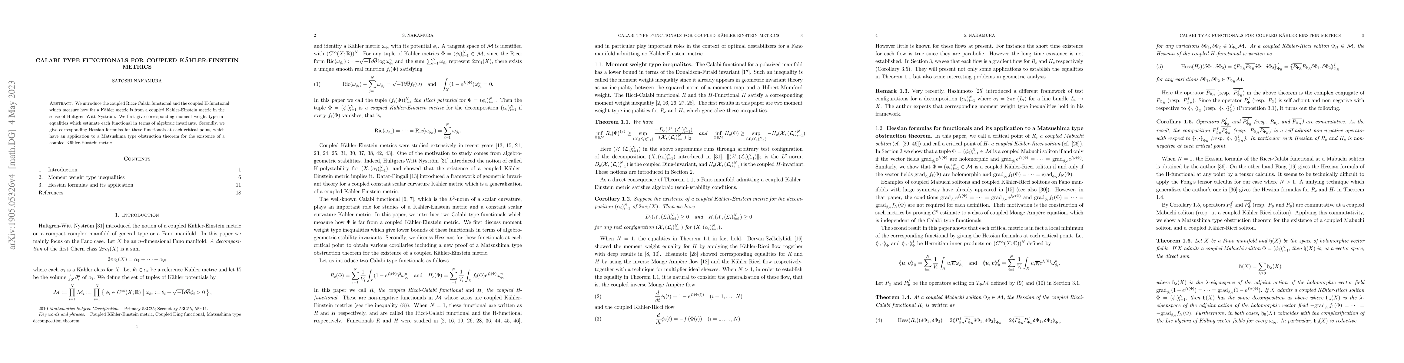 This paper introduces two new functionals, the coupled Ricci-Calabi functional and the coupled H-functional, to measure the distance to coupled Kähler-Einstein metrics. It provides moment weight type inequalities estimating these functionals and Hessian formulas at critical points, which contribute to a Matsushima-type obstruction theorem for the existence of such metrics.