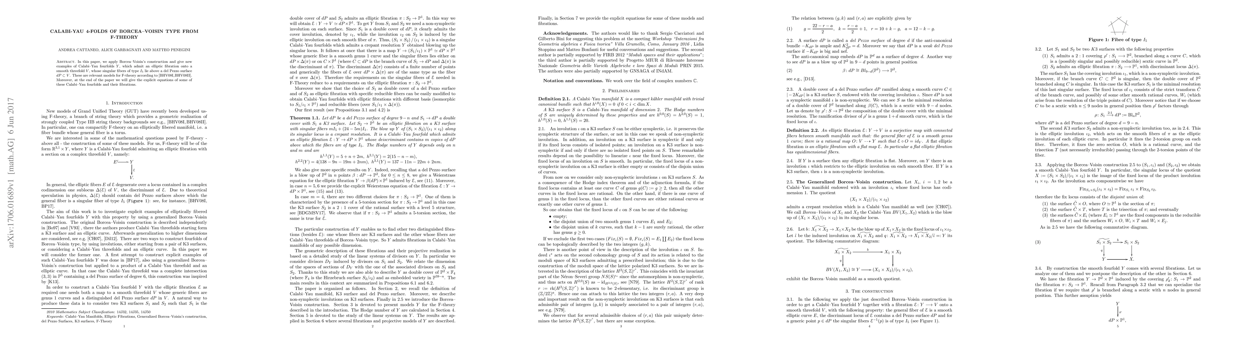 In this paper, we apply Borcea--Voisin's construction and give new examples of Calabi--Yau fourfolds $Y$, which admit an elliptic fibration onto a smooth threefold $V$, whose singular fibers of type $I_5$ lie above a del Pezzo surface $dP \subset V$. These are relevant models for F-theory according to papers by C. Beasley, J. J. Heckman, C. Vafa. Moreover, at the end of the paper we will give the explicit equations of some of these Calabi--Yau fourfolds and their fibrations.