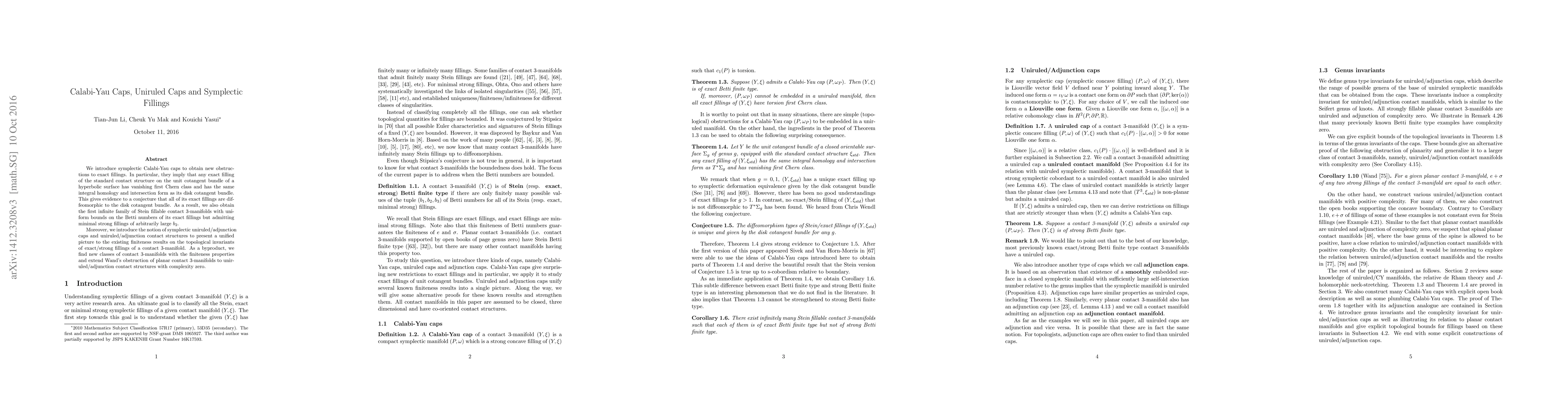 We introduce symplectic Calabi-Yau caps to obtain new obstructions to exact fillings. In particular, it implies that any exact filling of the standard unit cotangent bundle of a hyperbolic surface has vanishing first Chern class and has the same integral homology and intersection form as its disk cotangent bundle. This gives evidence to a conjecture that all of its exact fillings are diffeomorphic to the disk cotangent bundle. As a result, we also obtain the first infinitely family of Stein fillable contact 3-manifolds with uniform bounds on the Betti numbers of its exact fillings but admitting minimal strong fillings of arbitrarily large $b_2$. Moreover, we introduce the notion of symplectic uniruled/adjunction caps and uniruled/adjunction contact structures to present a unified picture to the existing finiteness results on the topological invariants of exact/strong fillings of a contact 3-manifold. As a byproduct, we find new classes of contact 3-manifolds with the finiteness property and extend Wand's obstruction of planar contact 3-manifolds to uniruled/adjunction contact structures with complexity zero. structures with complexity zero.