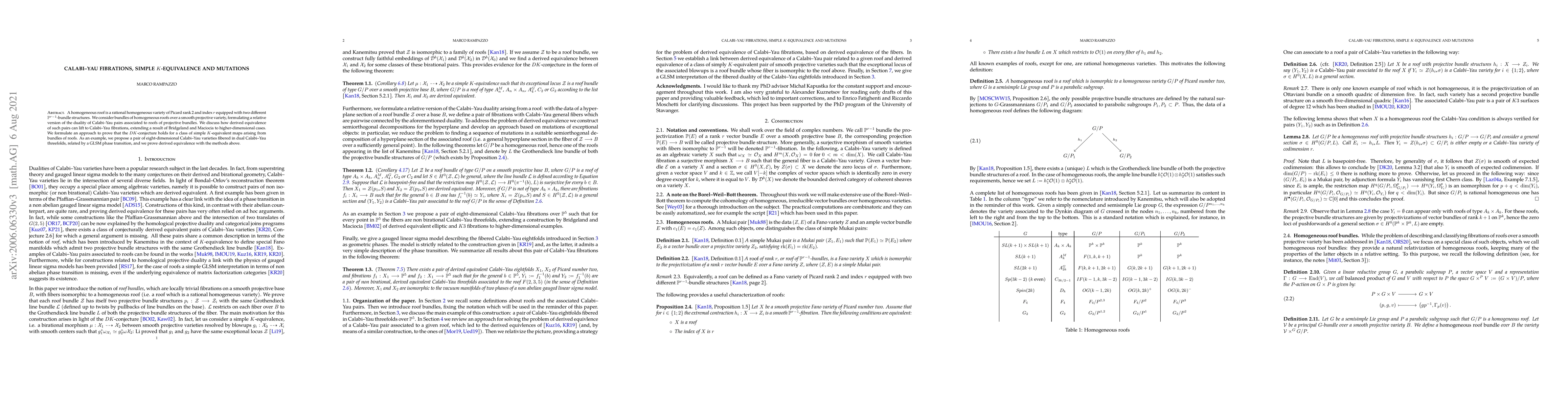 A homogeneous roof is a rational homogeneous variety of Picard rank 2 and index $r$ equipped with two different $\mathbb P^{r-1}$-bundle structures. We consider bundles of homogeneous roofs over a smooth projective variety, formulating a relative version of the duality of Calabi--Yau pairs associated to roofs of projective bundles. We discuss how derived equivalence of such pairs can lift to Calabi--Yau fibrations, extending a result of Bridgeland and Maciocia to higher-dimensional cases. We formulate an approach to prove that the $DK$-conjecture holds for a class of simple $K$-equivalent maps arising from bundles of roofs. As an example, we propose a pair of eight-dimensional Calabi--Yau varieties fibered in dual Calabi--Yau threefolds, related by a GLSM phase transition, and we prove derived equivalence with the methods above.