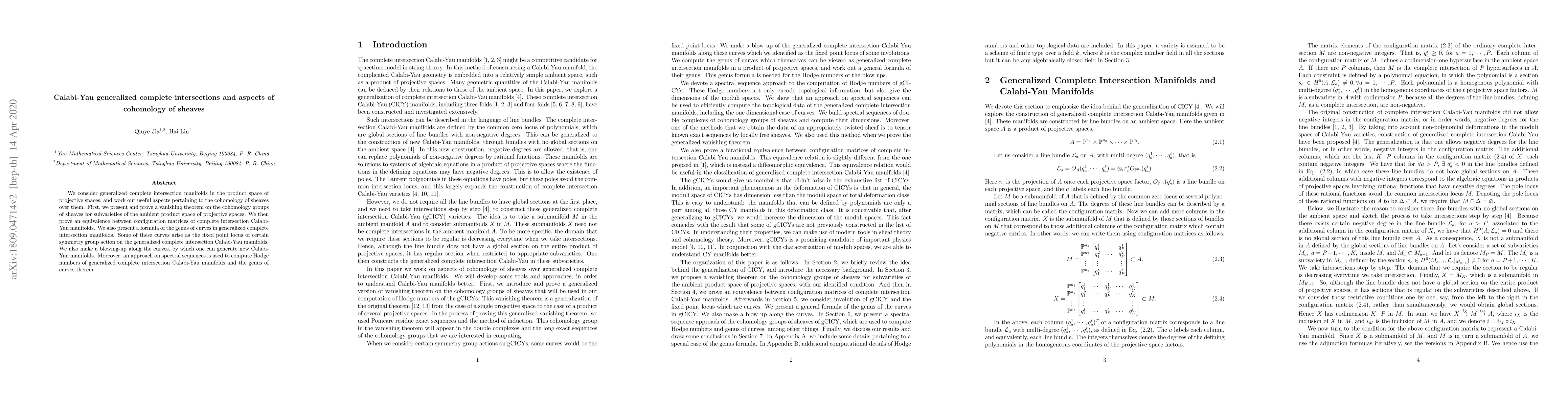 This paper investigates generalized complete intersection manifolds within product spaces of projective spaces, focusing on sheaf cohomology aspects. It presents a vanishing theorem for subvarieties' cohomology and establishes an equivalence for Calabi-Yau manifolds' configuration matrices, alongside a genus formula for curves, including those arising from symmetry group actions. Blowing-up along these curves generates new Calabi-Yau manifolds, and spectral sequences are employed to compute their Hodge numbers and curve genera.