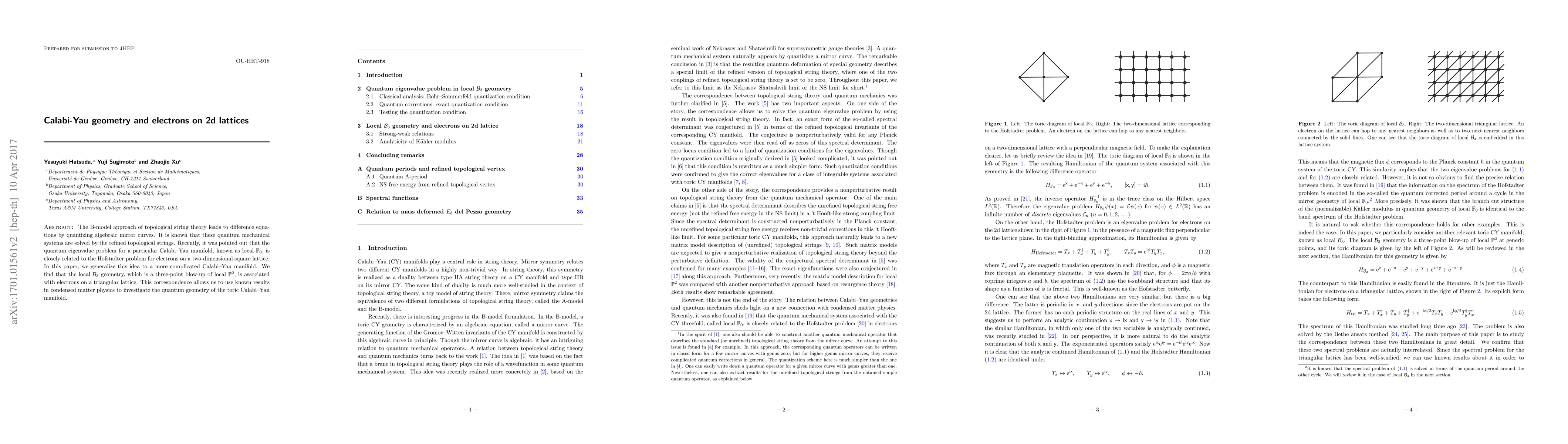 This research explores the connection between Calabi-Yau geometry in topological string theory and condensed matter physics, specifically the Hofstadter problem for electrons on 2D lattices. It generalizes this correspondence to the local $\mathcal{B}_3$ geometry, associating it with electrons on a triangular lattice and using condensed matter physics insights to study the quantum geometry of toric Calabi-Yau manifolds.