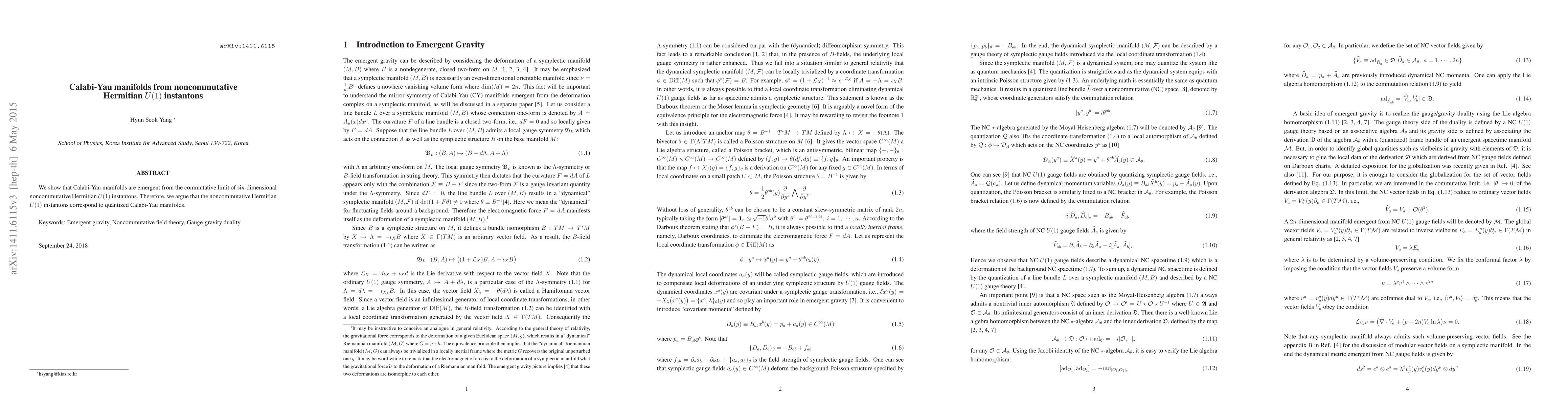 Two-line summary: This research demonstrates that Calabi-Yau manifolds arise as the commutative limit of six-dimensional noncommutative Hermitian U(1) instantons, suggesting that the latter represent a quantization of the former. This connection provides a novel perspective on the structure and emergence of Calabi-Yau manifolds.