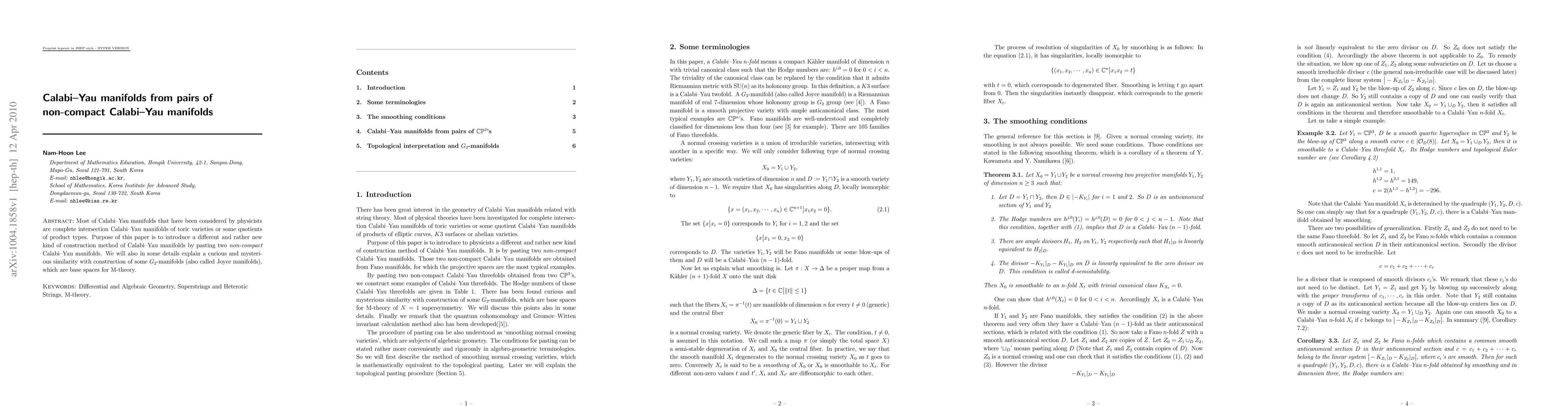 Most of Calabi-Yau manifolds that have been considered by physicists are complete intersection Calabi-Yau manifolds of toric varieties or some quotients of product types. Purpose of this paper is to introduce a different and rather new kind of construction method of Calabi-Yau manifolds by pasting two non-compact Calabi-Yau manifolds. We will also in some details explain a curious and mysterious similarity with construction of some $G_2$-manifolds (also called Joyce manifolds), which are base spaces for M-theory.