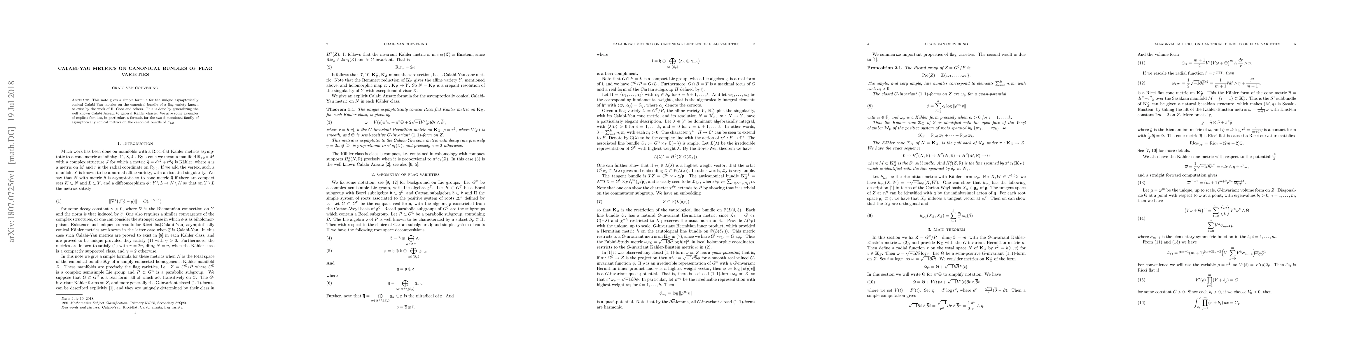 Summary: This paper provides a formula for unique asymptotically conical Calabi-Yau metrics on canonical bundles of flag varieties by generalizing the Calabi Ansatz to general Kähler classes, and gives explicit examples for a two-dimensional family, specifically for $F_{1,2}$.
