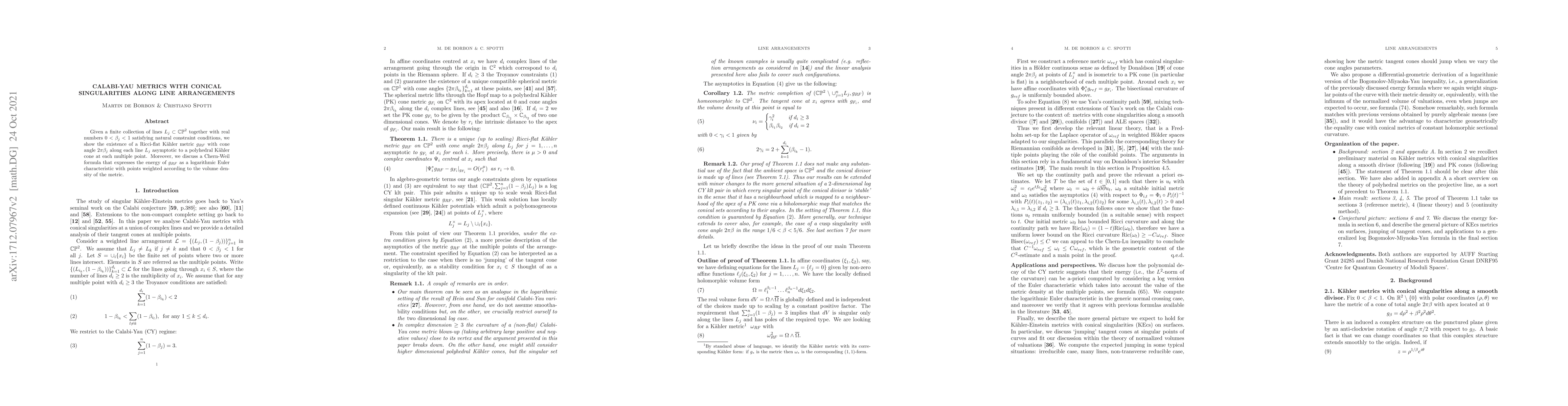 A new type of Calabi-Yau metric is introduced that can handle conical singularities along line arrangements in the projective plane. This breakthrough enables a logarithmic expression for the metric's energy based on volume density.