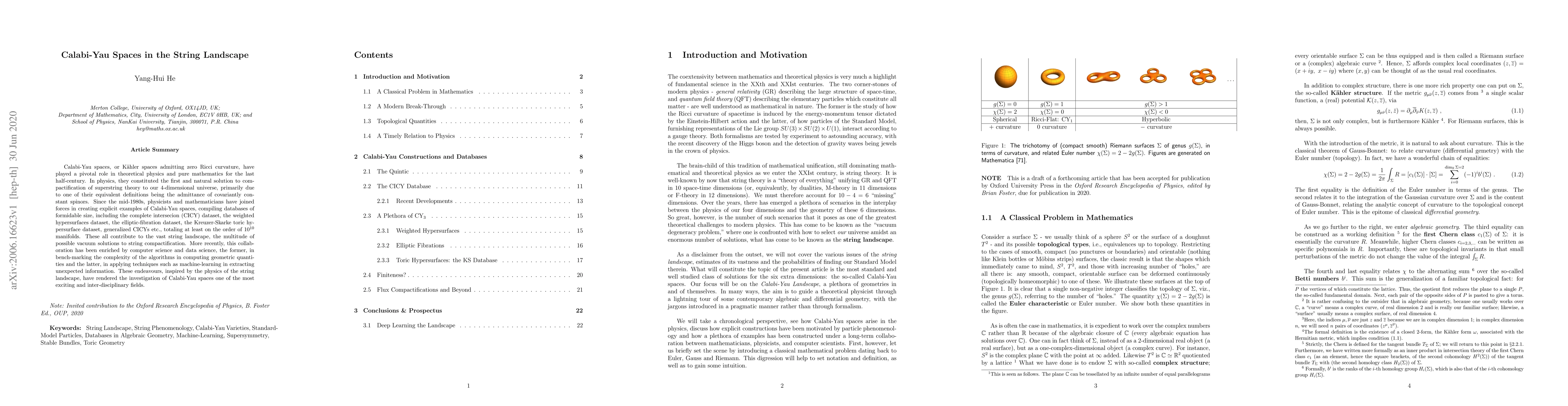 Calabi-Yau spaces, or Kahler spaces admitting zero Ricci curvature, have played a pivotal role in theoretical physics and pure mathematics for the last half-century. In physics, they constituted the first and natural solution to compactification of superstring theory to our 4-dimensional universe, primarily due to one of their equivalent definitions being the admittance of covariantly constant spinors. Since the mid-1980s, physicists and mathematicians have joined forces in creating explicit examples of Calabi-Yau spaces, compiling databases of formidable size, including the complete intersecion (CICY) dataset, the weighted hypersurfaces dataset, the elliptic-fibration dataset, the Kreuzer-Skarke toric hypersurface dataset, generalized CICYs etc., totaling at least on the order of 10^10 manifolds. These all contribute to the vast string landscape, the multitude of possible vacuum solutions to string compactification. More recently, this collaboration has been enriched by computer science and data science, the former, in bench-marking the complexity of the algorithms in computing geometric quantities and the latter, in applying techniques such as machine-learning in extracting unexpected information. These endeavours, inspired by the physics of the string landscape, have rendered the investigation of Calabi-Yau spaces one of the most exciting and inter-disciplinary fields. Invited contribution to the Oxford Research Encyclopedia of Physics, B.~Foster Ed., OUP, 2020