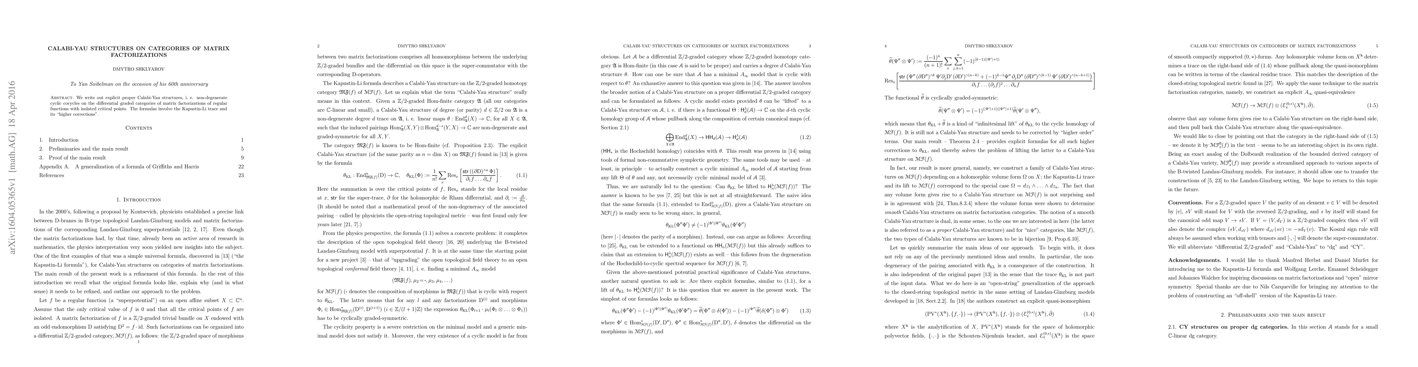 We write out explicit proper Calabi-Yau structures, i. e. non-degenerate cyclic cocycles on the differential graded categories of matrix factorizations of regular functions with isolated critical points. The formulas involve the Kapustin-Li trace and its "higher corrections".