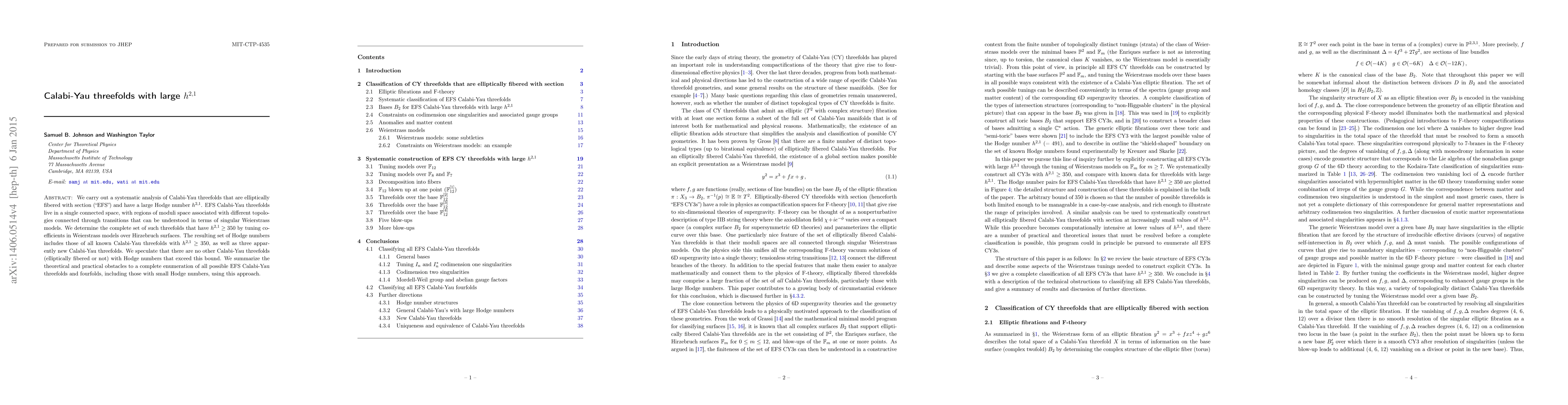 We carry out a systematic analysis of Calabi-Yau threefolds that are elliptically fibered with section ("EFS") and have a large Hodge number h^{2, 1}. EFS Calabi-Yau threefolds live in a single connected space, with regions of moduli space associated with different topologies connected through transitions that can be understood in terms of singular Weierstrass models. We determine the complete set of such threefolds that have h^{2, 1} >= 350 by tuning coefficients in Weierstrass models over Hirzebruch surfaces. The resulting set of Hodge numbers includes those of all known Calabi-Yau threefolds with h^{2, 1} >= 350, as well as three apparently new Calabi-Yau threefolds. We speculate that there are no other Calabi-Yau threefolds (elliptically fibered or not) with Hodge numbers that exceed this bound. We summarize the theoretical and practical obstacles to a complete enumeration of all possible EFS Calabi-Yau threefolds and fourfolds, including those with small Hodge numbers, using this approach.