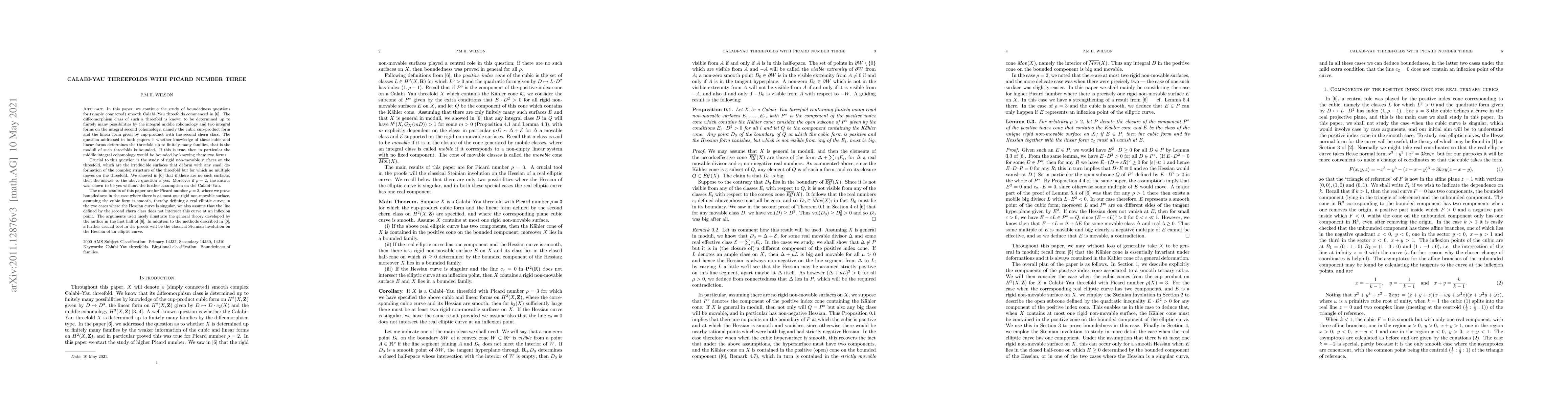 In this paper, we continue the study of boundedness questions for (simply connected) smooth Calabi-Yau threefolds commenced in arXiv:1706.01268. The diffeomorphism class of such a threefold is known to be determined up to finitely many possibilities by the integral middle cohomology and two integral forms on the integral second cohomology, namely the cubic cup-product form and the linear form given by cup-product with the second chern class. The question addressed in both papers is whether knowledge of these cubic and linear forms determines the threefold up to finitely many families, that is the moduli of such threefolds is bounded. If this is true, then in particular the middle integral cohomology would be bounded by knowing these two forms. Crucial to this question is the study of rigid non-movable surfaces on the threefold, which are the irreducible surfaces that deform with any small deformation of the complex structure of the threefold but for which no multiple moves on the threefold. We showed in the previous paper that if there are no such surfaces, then the answer to the above question is yes. Moreover if the Picard number is 2, the answer was shown to be yes without any further assumptions on the Calabi-Yau threefold. The main results of this paper are for Picard number 3, where we prove boundedness in the case where there is at most one rigid non-movable surface, assuming the cubic form is smooth (thereby defining a real elliptic curve); in the two cases where the Hessian curve is singular, we also assume that the line defined by the second chern class does not intersect this curve at an inflexion point. In addition to the methods described in the previous paper, a further crucial tool in the proofs will be the classical Steinian involution on the Hessian of an elliptic curve.