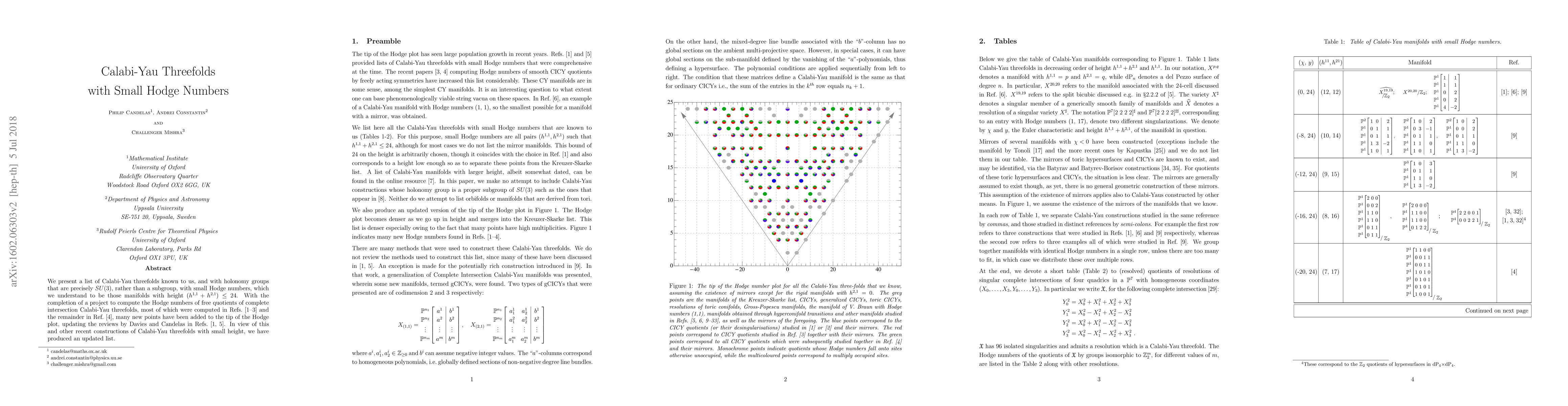 We present a list of Calabi-Yau threefolds known to us, and with holonomy groups that are precisely SU(3), rather than a subgroup, with small Hodge numbers, which we understand to be those manifolds with height $(h^{1,1}+h^{2,1})\le 24$. With the completion of a project to compute the Hodge numbers of free quotients of complete intersection Calabi-Yau threefolds, most of which were computed in Refs. [1-3] and the remainder in Ref. [4], many new points have been added to the tip of the Hodge plot, updating the reviews by Davies and Candelas in Refs. [1, 5]. In view of this and other recent constructions of Calabi-Yau threefolds with small height, we have produced an updated list.