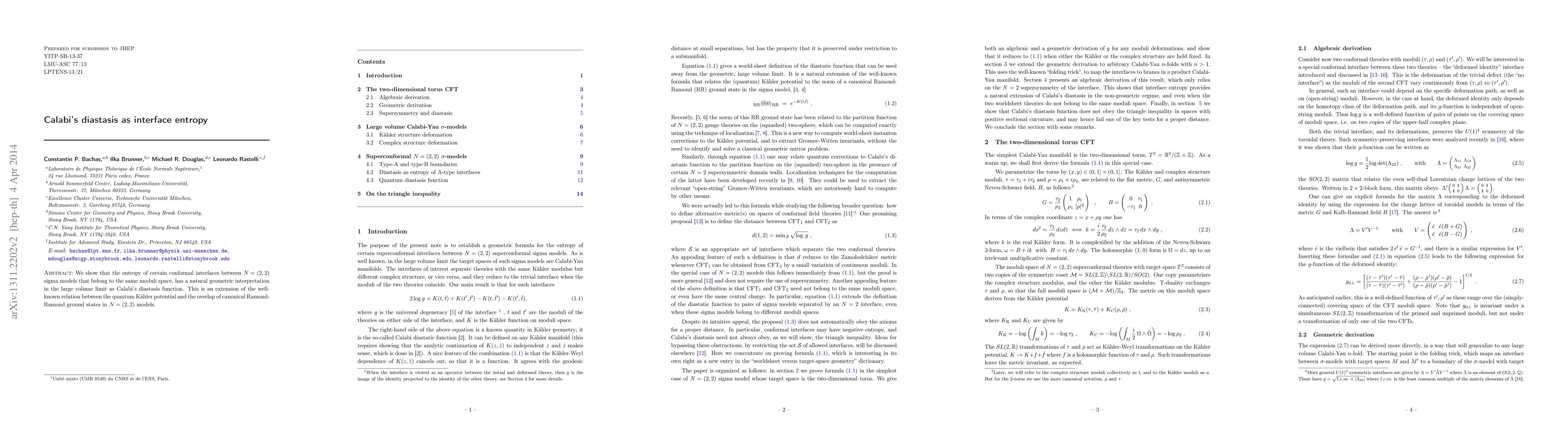 We show that the entropy of certain conformal interfaces between $N=(2,2)$ sigma models that belong to the same moduli space, has a natural geometric interpretation in the large volume limit as Calabi's diastasis function. This is an extension of the well-known relation between the quantum K\"ahler potential and the overlap of canonical Ramond-Ramond ground states in $N=(2,2)$ models.