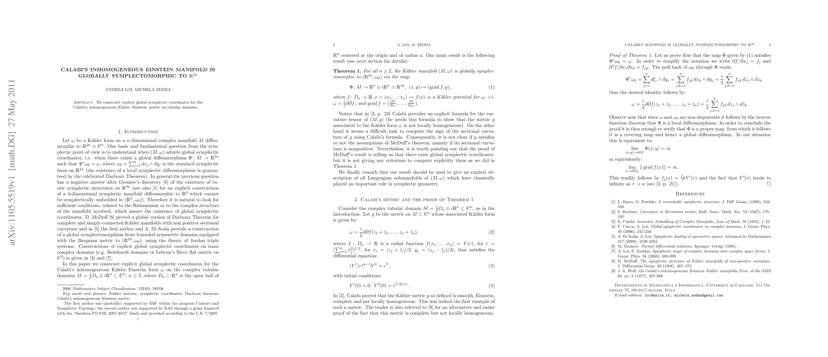 We construct explicit global symplectic coordinates for the Calabi's inhomogeneous Kaehler-Einstein metric on tubular domains.