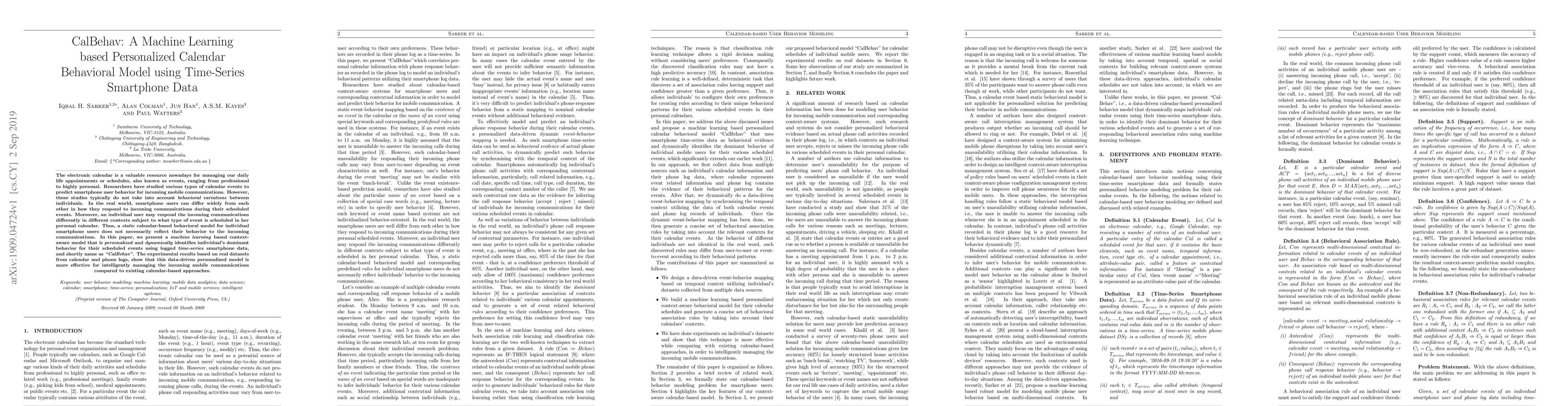 The paper introduces "CalBehav," a machine learning model that personalizes calendar behavioral predictions using time-series smartphone data, addressing individual variations in response to incoming communications. Experimental results demonstrate CalBehav's superior effectiveness over static calendar-based approaches.