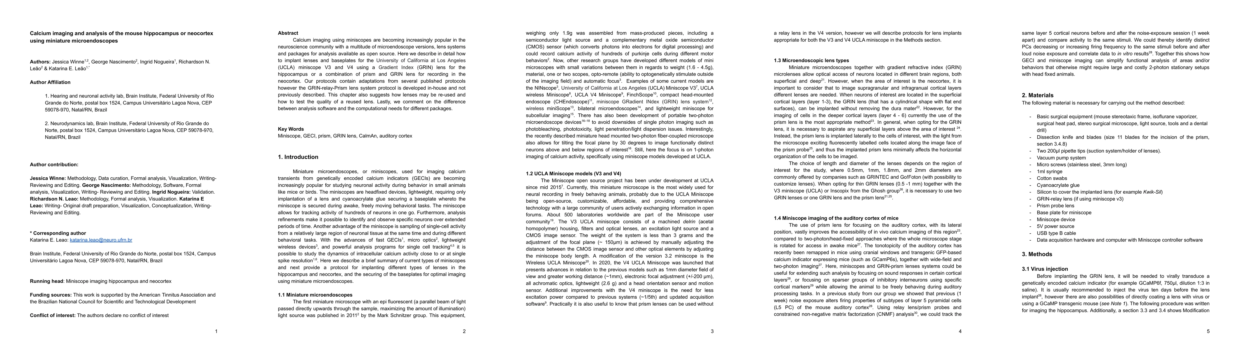 Calcium imaging using miniscopes are becoming increasingly popular in the neuroscience community with a multitude of microendoscope versions, lens systems and packages for analysis available as open source. Here we describe in detail how to implant lenses and baseplates for the University of California at Los Angeles (UCLA) miniscope V3 and V4 using a Gradient Index (GRIN) lens for the hippocampus or a combination of prism and GRIN lens for recording in the neocortex. Our protocols contain adaptations from several published protocols however the GRIN-relay-Prism lens system protocol is developed in-house and not previously described. This chapter also suggests how lenses may be re-used and how to test the quality of a reused lens. Lastly, we comment on the difference between analysis software and the computational needs for different packages.