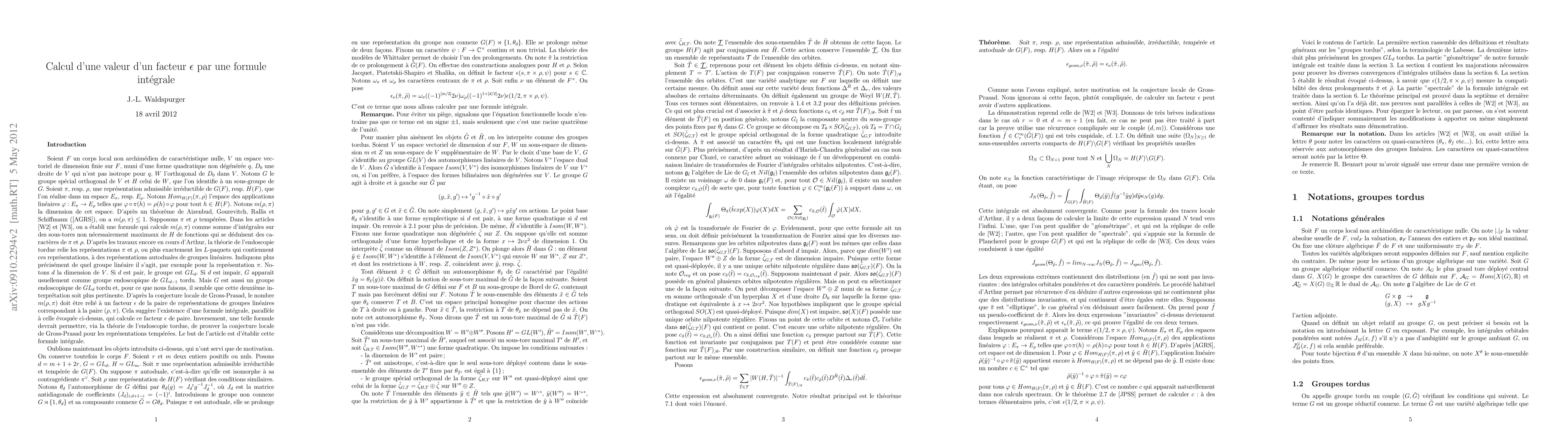 Let d and m be two natural numbers of distinct parities. Let $\pi$ be an admissible irreducible tempered representation of GL(d,F), where F is a p-adic field. We assume that $\pi$ is self-dual. Then we can extend $\pi$ as a representation $\tilde{\pi}$ of a non-connected group $GL(d,F)\rtimes \{1,\theta\}$. Let $\rho$ be a representation of GL(m,F). We assume that it has similar properties as $\pi$. Jacquet, Piatetski-Shapiro and Shalika have defined the factor $\epsilon(s,\pi\times\rho,\psi)$. We prove that we can compute $\epsilon(1/2,\pi\times\rho,\psi)$ by an integral formula where occur the characters of $\tilde{\pi}$ and $\tilde{\rho}$. It's similar to the formula which, for special orthogonal groups, computes the multiplicities appearing in the local Gross-Prasad conjecture.