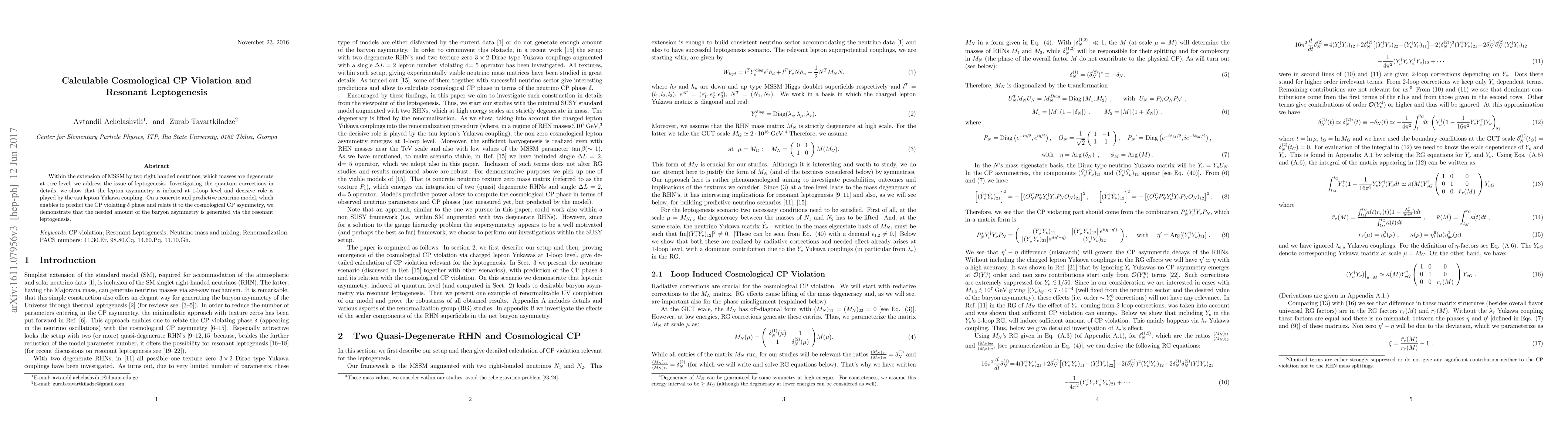 Within the extension of MSSM by two right handed neutrinos, which masses are degenerate at tree level, we address the issue of leptogenesis. Investigating the quantum corrections in details, we show that the lepton asymmetry is induced at 1-loop level and decisive role is played by the tau lepton Yukawa coupling. On a concrete and predictive neutrino model, which enables to predict the CP violating $\delta $ phase and relate it to the cosmological CP asymmetry, we demonstrate that the needed amount of the baryon asymmetry is generated via the resonant leptogenesis.