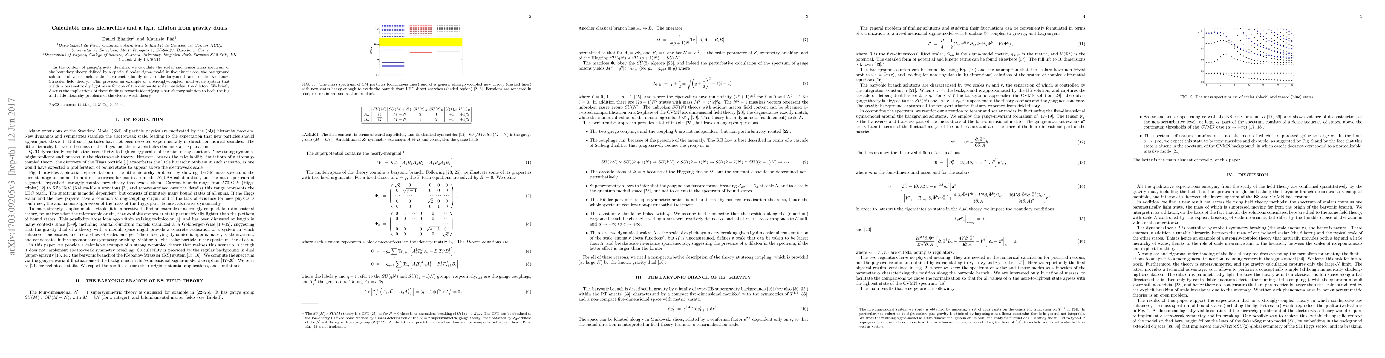 In the context of gauge/gravity dualities, we calculate the scalar and tensor mass spectrum of the boundary theory defined by a special 8-scalar sigma-model in five dimensions, the background solutions of which include the 1-parameter family dual to the baryonic branch of the Klebanov-Strassler field theory. This provides an example of a strongly-coupled, multi-scale system that yields a parametrically light mass for one of the composite scalar particles: the dilaton. We briefly discuss the implications of these findings towards identifying a satisfactory solution to both the big and little hierarchy problems of the electro-weak theory.
