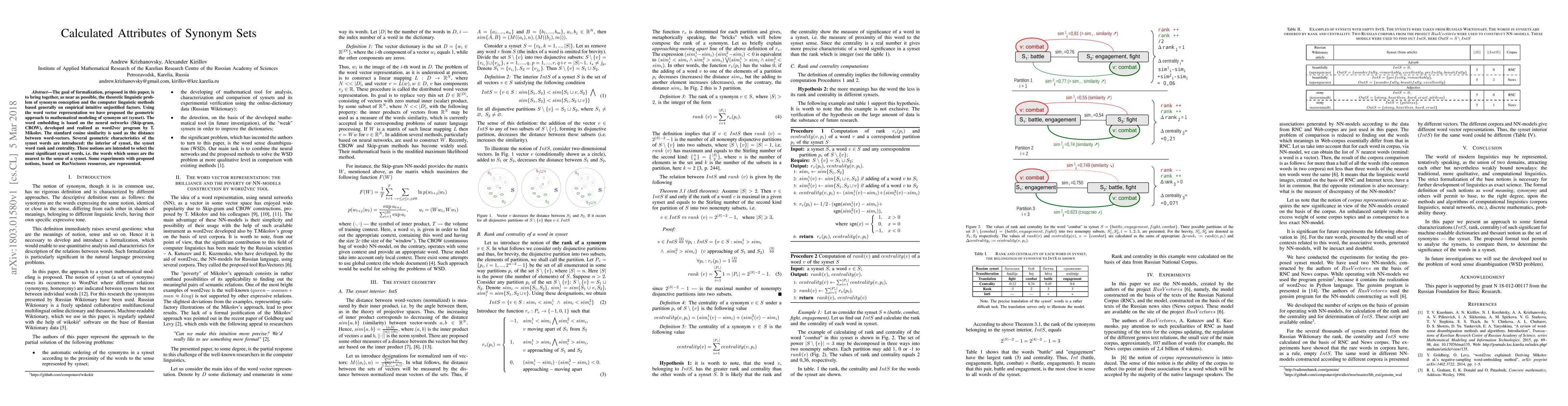 The goal of formalization, proposed in this paper, is to bring together, as near as possible, the theoretic linguistic problem of synonym conception and the computer linguistic methods based generally on empirical intuitive unjustified factors. Using the word vector representation we have proposed the geometric approach to mathematical modeling of synonym set (synset). The word embedding is based on the neural networks (Skip-gram, CBOW), developed and realized as word2vec program by T. Mikolov. The standard cosine similarity is used as the distance between word-vectors. Several geometric characteristics of the synset words are introduced: the interior of synset, the synset word rank and centrality. These notions are intended to select the most significant synset words, i.e. the words which senses are the nearest to the sense of a synset. Some experiments with proposed notions, based on RusVectores resources, are represented. A brief description of this work can be viewed in slides https://goo.gl/K82Fei