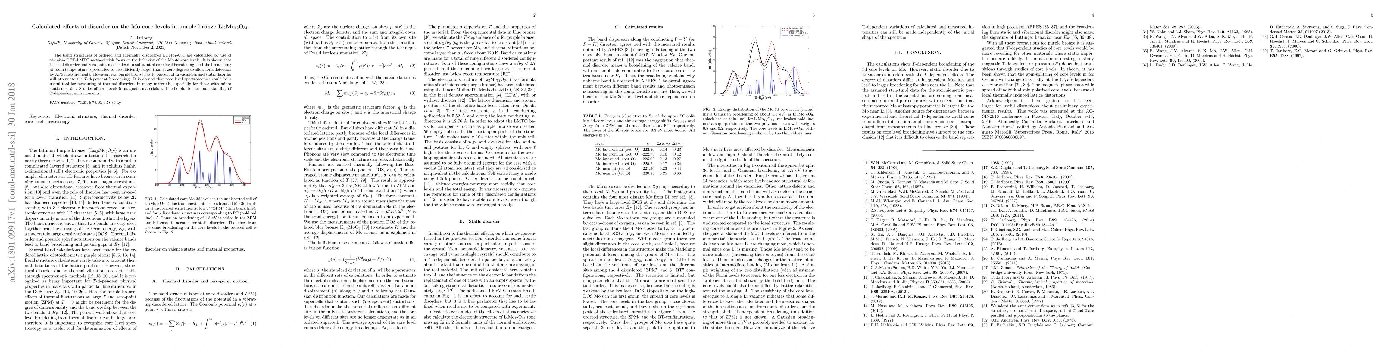 The band structures of ordered and thermally disordered Li$_2$Mo$_{12}$O$_{34}$ are calculated by use of ab-initio DFT-LMTO method with focus on the behavior of the Mo 3d-core levels. It is shown that thermal disorder and zero-point motion lead to substantial core level broadening, and the broadening at room temperature is predicted to be sufficiently larger than at zero degrees to allow for a detection by XPS measurements. However, real purple bronze has 10 percent of Li vacancies and static disorder will attenuate the $T$-dependent broadening. It is argued that core level spectroscopies could be a useful tool for measuring of thermal disorders in many materials, especially for those with minor static disorder. Studies of core levels in magnetic materials will be helpful for an understanding of $T$-dependent spin moments.