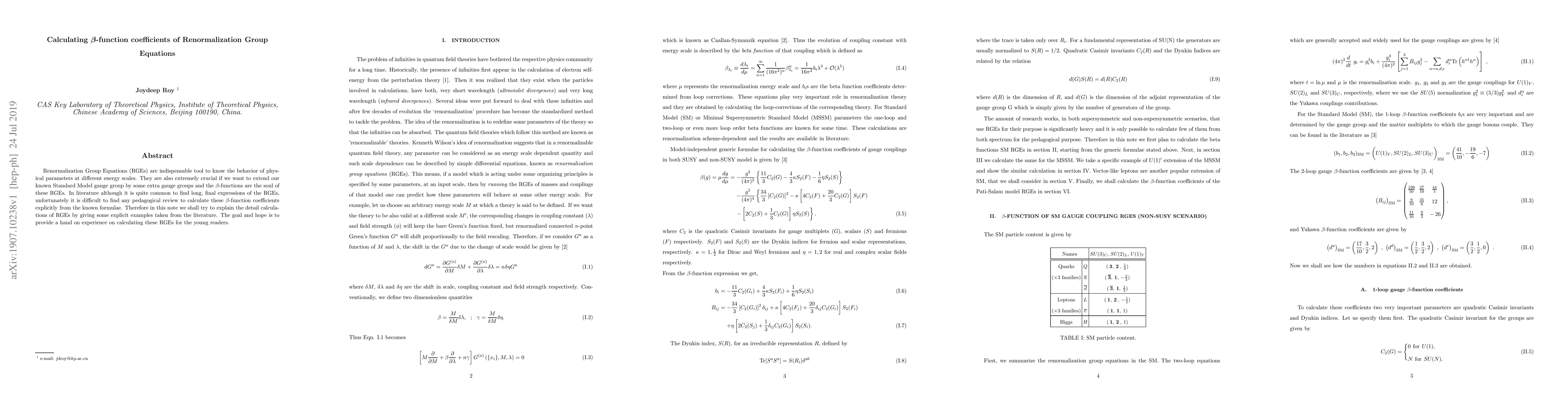 This paper aims to provide a detailed, pedagogical review of the calculations for $\beta$-function coefficients in Renormalization Group Equations (RGEs), offering explicit examples to help young readers understand and perform these calculations themselves. The focus is on making the complex process of RGEs more accessible and practical.
