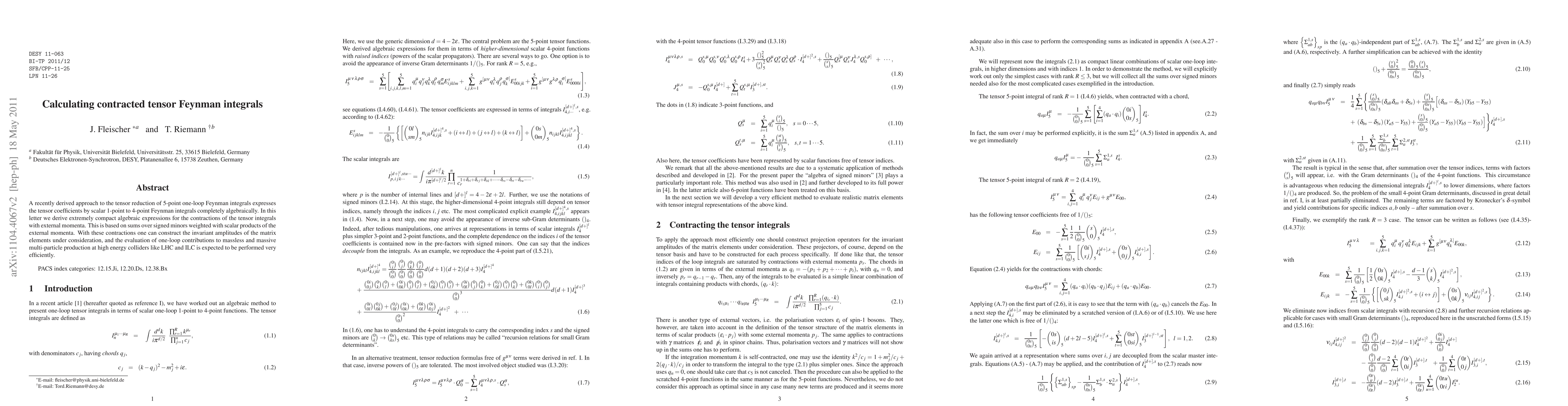 This paper presents a new method for calculating contracted tensor Feynman integrals by expressing them algebraically through scalar Feynman integrals. The approach uses sums over signed minors weighted by scalar products of external momenta, enabling efficient evaluation of one-loop contributions for high-energy collider processes.