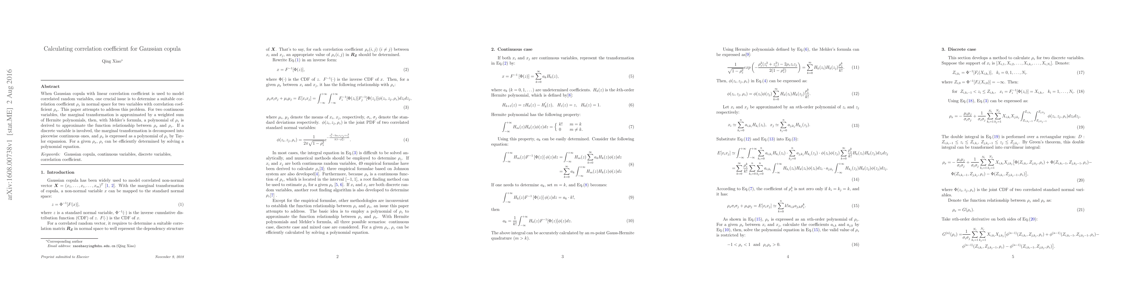 This paper develops a method to calculate the correlation coefficient $\rho_z$ in normal space for modeling correlated random variables using Gaussian copula, given a correlation coefficient $\rho_x$. It uses Hermite polynomials and Mehler's formula for continuous variables and Taylor expansion for discrete variables.